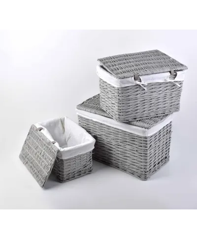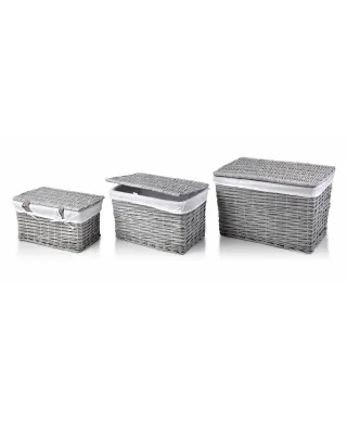 Komplet 3 kufrów z wikliny marki MONDEX. Komplet zawiera 3 prostokątne kufry:w rozmiarze L, M i S. Wykonane z wikliny, zamykane od góry. Wyściełane szarym\materiałem, idealnie nadają się do przechowywania i utrzymania porządku.\\XL:58x38x38cm\L:51x32x32cm\M:44x26x26cm