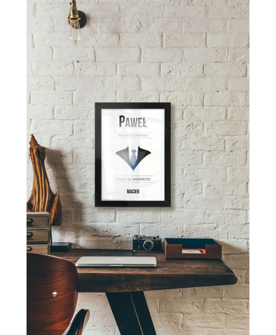 Plakat A4 Podziękowanie dla Świadka Jeśli szukasz oryginalnego sposobu by podziękować swojemu świadkowi za okazaną pomoc, to plakat z kolorową grafiką z Waszymi imionami będzie świetnym wyborem. Taki plakat to wzruszający prezent, którypozostanie wspaniałą pamiątką na lata. Nasze plakaty wyróżnia: Rewelacyjna jakość, Nasycone iwyraźnebarwy, Wytrzymały papier220g/m2 Satynowa powierzchnia, Druk cyfrowy. Jak zamówić plakat z podziękowaniem dla Świadka? Zamów interesujący Cię rozmiar i dokonaj płatności. Na maila, który podałeś w formularzu otrzymasz wiadomość z potwierdzeniem zamówienia. W odpowiedzi zwrotnej do potwierdzenia napisz nam, jakie imiona oraz który z kolorów włosów mają mieć Panna Młoda i Świadkowa. Gotowe!