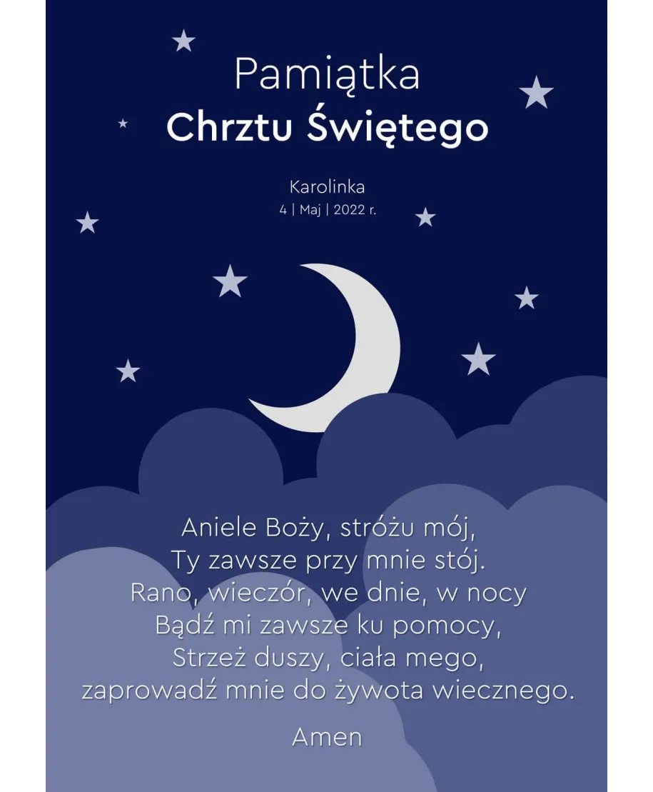 Plakat A4 Plakat dla dzieci Pamiątka Chrztu Świętego 21x29,7 cm w czarnej ramce Jeśli szukasz prezentu na pamiętkę Chrztu Świętego, to zamów nasz oryginalny plakat w ramie! Znajduje się na nimmodlitwa, data oraz imię dziecka. Nasze plakaty wyróżnia: Rewelacyjna jakość, Nasycone iwyraźnebarwy, Wytrzymały papier220g/m2 Satynowa powierzchnia, Druk cyfrowy, Oprawiony w prostą i smukłą czarną ramkę. Jak zamówić plakatPamiątka Chrztu Świętego? Zamów interesujący Cię rozmiar i dokonaj płatności, a namaila, który podałeś w formularzu otrzymasz wiadomość z potwierdzeniem zamówienia. W odpowiedzi zwrotnej podaj nam miejscowość oraz dane, jakie mają znaleźć się na plakacie.