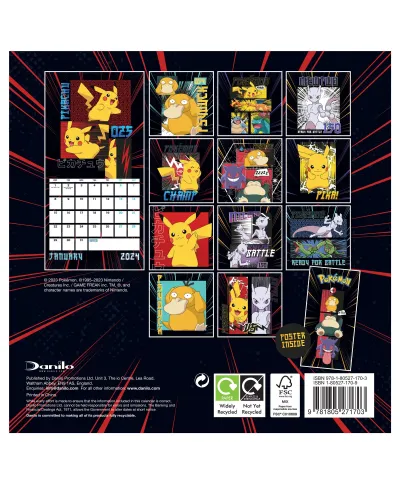 Pokemon oficjalny kalendarz na ścianę na 2025rok Oryginalny i licencjonowany kalendarz, posiada 12 rozkładanych stron o wymiarach 18x36cm. Na każdej z kart znajduje się duża fotografiaoraz czytelne kalendarium z miejscem na notatki. Okładki wykonane są z papieru powlekanego matowego i laminowanego o gramaturze 250 g/m2, wnętrze z papieru powlekanego matowego o gramaturze 150 g/m2. Nagłówki są języku angielskim, niemieckim, hiszpańskim, francuskim, włoskim i polskim. Oprawa zszywkowa. Złożony kalendarz 18x18 cm. Rozłożony kalendarz 18x66 cm. Zawiera otwór 5 mm do zawieszenia na ścianie.