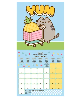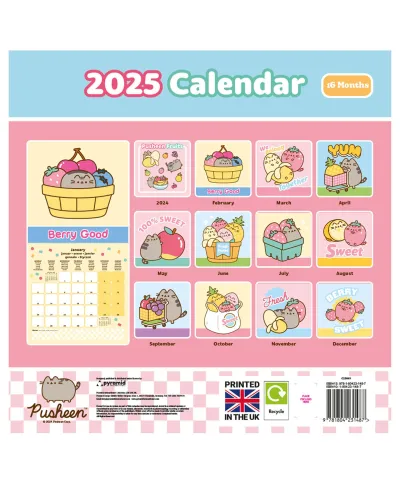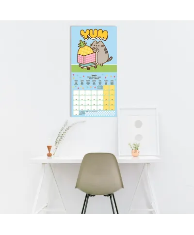 Pusheen Fruits oficjalny kalendarz na ścianę na 2025rok Oryginalny i licencjonowany kalendarz, posiada 12 rozkładanych stron o wymiarach 30x60 cm. Na każdej z kart znajduje się duża fotografiaoraz czytelne kalendarium z miejscem na notatki. Okładki wykonane są z papieru powlekanego matowego i laminowanego o gramaturze 250 g/m2, wnętrze z papieru powlekanego matowego o gramaturze 150 g/m2. Nagłówki są języku angielskim, niemieckim, hiszpańskim, francuskim, włoskim i polskim. Oprawa zszywkowa. Złożony kalendarz 30x30 cm. Rozłożony kalendarz 30x60 cm. Zawiera otwór 5 mm do zawieszenia na ścianie.