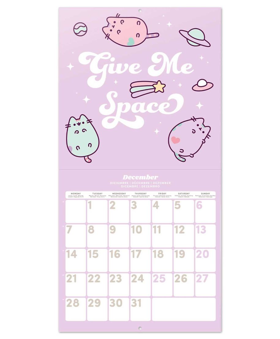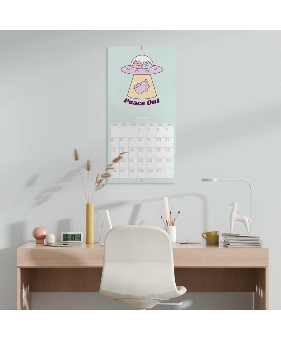 Pusheen oficjalny kalendarz na ścianę na 2026rok Oryginalny i licencjonowany kalendarz, posiada 12 rozkładanych stron o wymiarach 30x60 cm. Na każdej z kart znajduje się duża fotografiaoraz czytelne kalendarium z miejscem na notatki. W kalendarzu znajduje się 12 unikalnych zdjęć dla każdego miesiąca + plakat. Okładki wykonane są z papieru powlekanego matowego i laminowanego o gramaturze 250 g/m2, wnętrze z papieru powlekanego matowego o gramaturze 150 g/m2. Nagłówki są w 6 językach:angielski, hiszpański, francuski, włoski, niemiecki i portugalski. Oprawa zszywkowa. Złożony kalendarz 30x30 cm. Rozłożony kalendarz 30x60 cm. Zawiera otwór 5 mm do zawieszenia na ścianie.