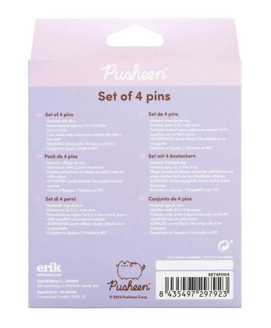 Pusheen - zestaw 4 przypinek Numer katalogowy: SET4P004 Producent: Erik Zestaw Pusheen od Erik zawiera cztery metalowe przypinki z kolorowymi grafikami kotki Pusheen. Każda przypinka ma zapięcie motylkowe. Idealny drobiazg do ozdobienia torby, plecaka lub ubrania. Wymiary opakowania 11,5x2x15 cm. Szczegóły techniczne Wymiary opakowania: 11,5x2x15 cm Zawartość: 4 metalowe przypinki Zapięcie: motylkowe Motyw: Pusheen Producent: Erik Oryginalny produkt na oficjalnej licencji Pusheen, wyprodukowany przez Erik.
