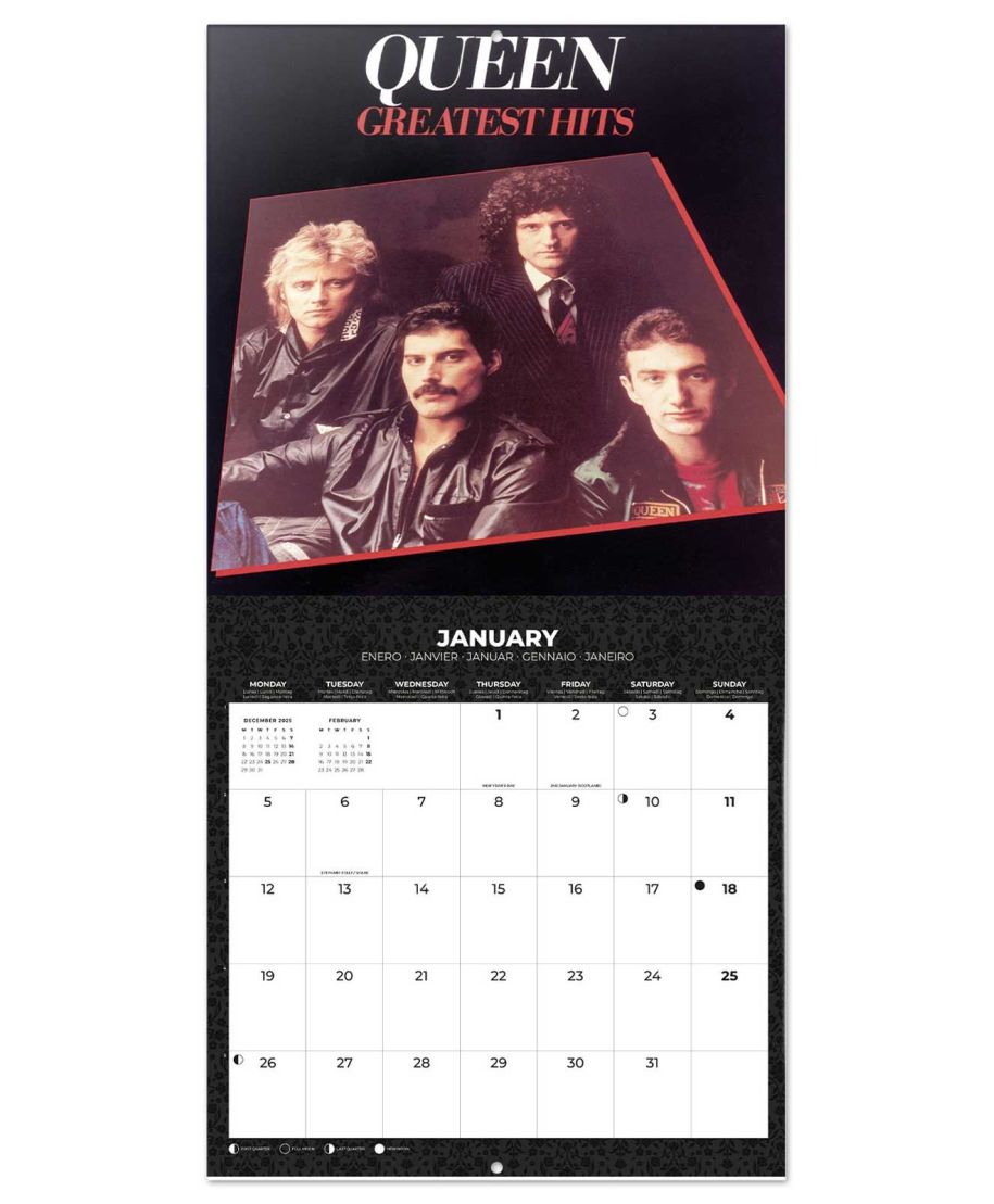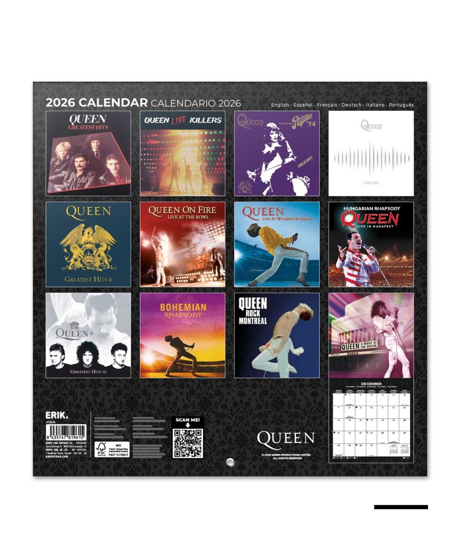 Queen oficjalny kalendarz na ścianę na 2026rok Oryginalny i licencjonowany kalendarz, posiada 12 rozkładanych stron o wymiarach 30x60 cm. Na każdej z kart znajduje się duża fotografiaoraz czytelne kalendarium z miejscem na notatki. W kalendarzu znajduje się 12 unikalnych zdjęć dla każdego miesiąca + plakat. Okładki wykonane są z papieru powlekanego matowego i laminowanego o gramaturze 250 g/m2, wnętrze z papieru powlekanego matowego o gramaturze 150 g/m2. Nagłówki są w 6 językach:angielski, hiszpański, francuski, włoski, niemiecki i portugalski. Oprawa zszywkowa. Złożony kalendarz 30x30 cm. Rozłożony kalendarz 30x60 cm. Zawiera otwór 5 mm do zawieszenia na ścianie.