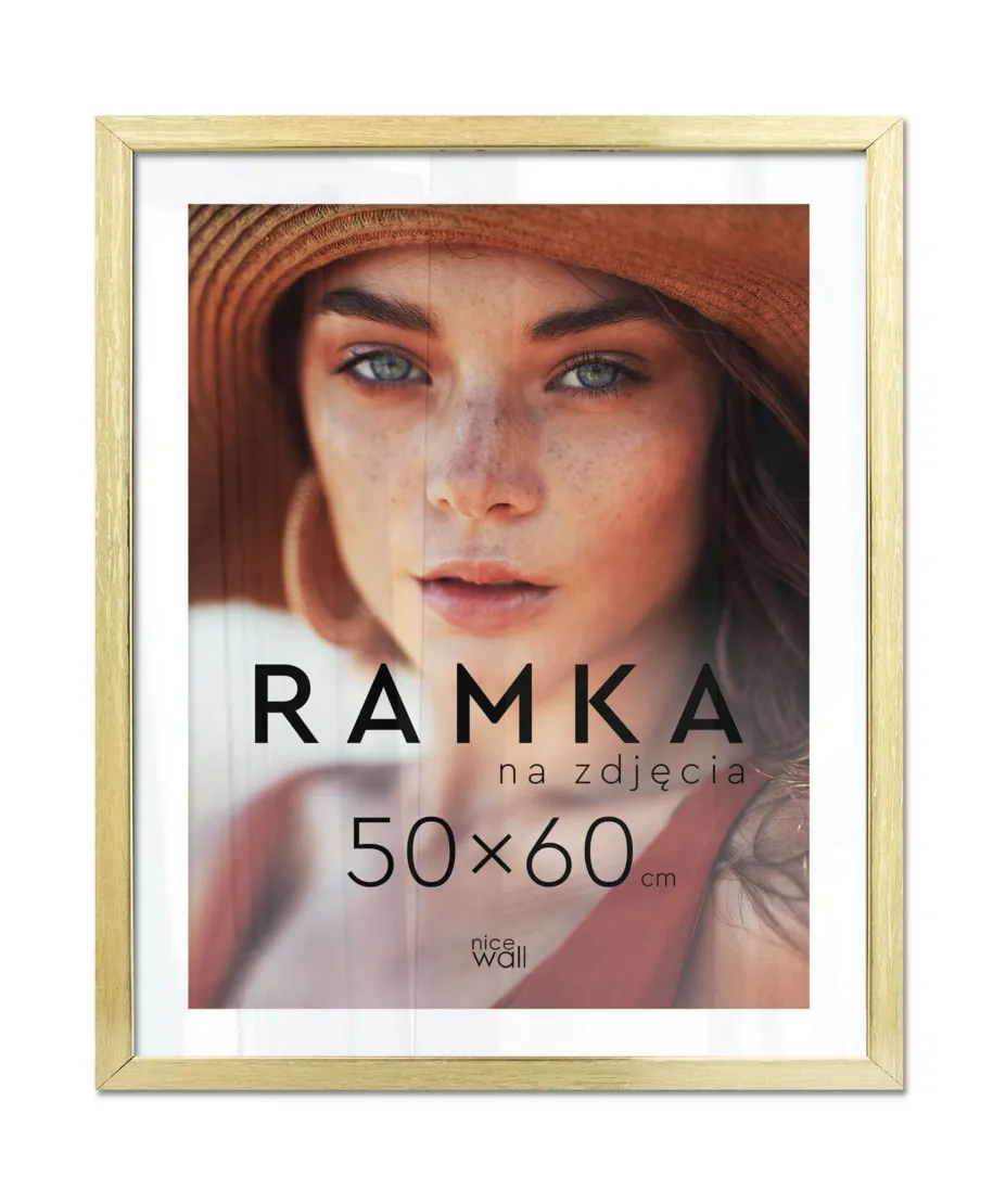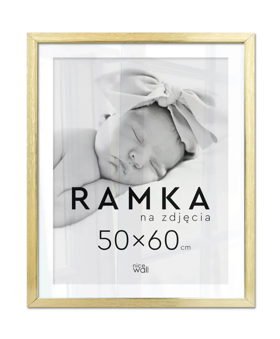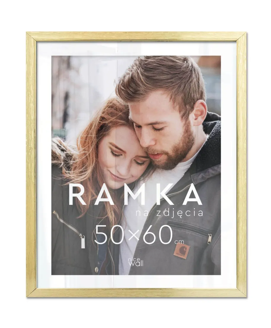 Ramka na zdjęcia 50x60 cm Złota Eleganckie ramki do oprawy plakatów, zdjęć i rysunków. Wykonane zpłyty pilśniowej, polistyrenu i lekkiej, przejrzystej pleksy 1 mm. Ramę można powiesić w pionie lub poziomie. Każdy egzemplarz jest zafoliowany. Posiadającertyfikat FSC. Wyprodukowanew Polsce. Wymiary ramy: 50x60 cm. Wymiary profilu: front 1,5 cm, bok 1,3 cm,