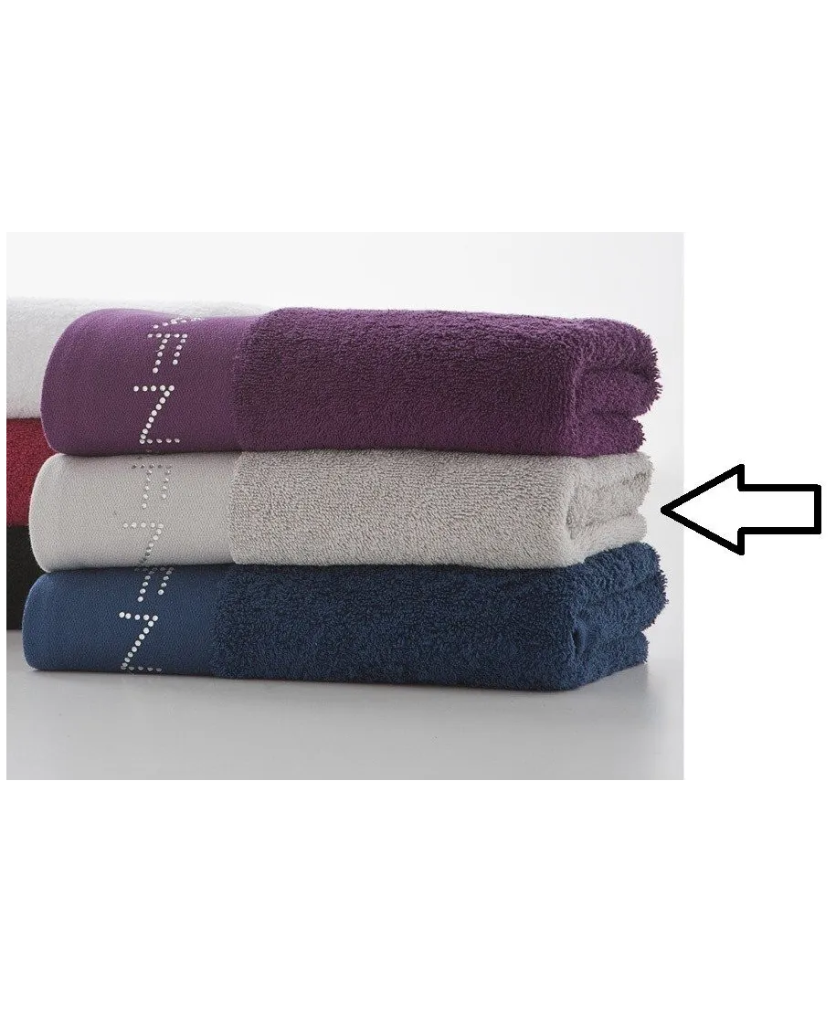 Piękny, elegancki ręcznik, wykonany z najwyższej jakości 100% bawełny. Absolutnie wyjątkowy jasny ręcznik, ozdobiony firmowym logo z kryształków podobnych do kryształków Swarovskiego. Niezwykle miękki i puszysty, cudownie przyjemny w dotyku. Dostępny w 6