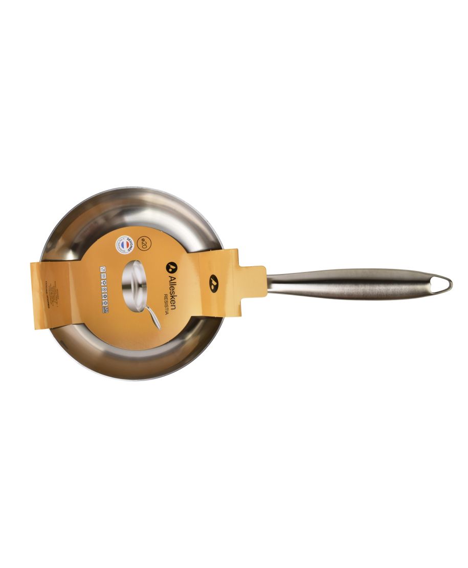 RESISTIA Patelnia stalowa 20cm z nowoczesnym designem marki Allesken.Patelnia RESISTIA o średnicy 20 cm to idealne rozwiązanie dla osób ceniących sobie elegancję oraz funkcjonalność w kuchni. Wykonana ze stali szlachetnej, łączy w sobie nowoczesny wygląd z doskonałą jakością wykonania, co sprawia, że każde gotowanie staje się przyjemnością.Kluczowe cechyWysokiej jakości stal nierdzewna zapewniająca trwałośćElegancki połysk, który przyciąga wzrokErgonomiczny kształt ułatwiający użytkowanieWiele zastosowań: od smażenia po duszenieŁatwość w czyszczeniu dzięki gładkiej powierzchniDlaczego warto wybrać kolekcję RESISTIASeria RESISTIA łączy w sobie nowoczesny design z funkcjonalnością, co czyni ją idealnym wyborem do każdej kuchni. Każda patelnia została starannie zaprojektowana z myślą o maksymalnym komforcie użytkowania. Elegancki połysk stali szlachetnej i ergonomiczny uchwyt sprawiają, że gotowanie staje się nie tylko łatwe, ale i estetyczne.Zastosowanie i pielęgnacjaPatelnię można używać na wszystkich typach kuchenek, w tym indukcyjnych. Zaleca się mycie ręczne, aby zachować jej oryginalny wygląd przez długi czas. Można używać lekko metalowych narzędzi kuchennych, ale należy unikać tych z ostrymi krawędziami, aby nie zarysować powierzchni.Dane techniczneWymiary 20x41x5,5cmMateriał stal nierdzewnaKolor srebrny, posiada dodatkowy klucz aby dokręcić rączkę.Kompatybilność wszystkie typy kuchenekZapakowana w obejmę oraz jednostkowo w brązowy karton.Kluczowe zasady i ryzyka:. Wpływ na wykończenie: Regularne mycie w zmywarce może sprawić, że patelnia z czasem stanie się matowa lub pojawią się na niej przebarwienia.. Korozja i plamy: Agresywne detergenty w zmywarce mogą powodować powstawanie plam, a w skrajnych przypadkach piting (wżery).. Sól: Nie pozostawiaj resztek słonego jedzenia na patelni przed włożeniem do zmywarki, ponieważ może to prowadzić do korozji.. Delikatne mycie: Jeśli zmywarka jest konieczna, używaj łagodnych detergentów i unikaj długich, bardzo gorących cykl