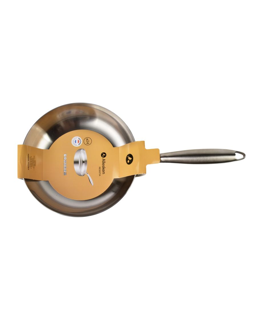 RESISTIA Patelnia stalowa 24cm z nowoczesnym designem marki AlleskenPatelnia RESISTIA o średnicy 24 cm to idealne rozwiązanie dla osób ceniących sobie elegancję oraz funkcjonalność w kuchni. Wykonana ze stali szlachetnej, łączy w sobie nowoczesny wygląd z doskonałą jakością wykonania, co sprawia, że każde gotowanie staje się przyjemnością.Kluczowe cechyWysokiej jakości stal nierdzewna zapewniająca trwałośćElegancki połysk, który przyciąga wzrokErgonomiczny kształt ułatwiający użytkowanieWiele zastosowań: od smażenia po duszenieŁatwość w czyszczeniu dzięki gładkiej powierzchniDlaczego warto wybrać kolekcję RESISTIASeria RESISTIA łączy w sobie nowoczesny design z funkcjonalnością, co czyni ją idealnym wyborem do każdej kuchni. Każda patelnia została starannie zaprojektowana z myślą o maksymalnym komforcie użytkowania. Elegancki połysk stali szlachetnej i ergonomiczny uchwyt sprawiają, że gotowanie staje się nie tylko łatwe, ale i estetyczne.Zastosowanie i pielęgnacjaPatelnię można używać na wszystkich typach kuchenek, w tym indukcyjnych. Zaleca się mycie ręczne, aby zachować jej oryginalny wygląd przez długi czas. Można używać lekko metalowych narzędzi kuchennych, ale należy unikać tych z ostrymi krawędziami, aby nie zarysować powierzchni.Dane techniczneWymiary 24x45x5,5cmMateriał stal nierdzewnaKolor srebrnyKompatybilność wszystkie typy kuchenek Zapakowana w obejmę oraz jednostkowo w brązowy karton.Kluczowe zasady i ryzyka:. Wpływ na wykończenie: Regularne mycie w zmywarce może sprawić, że patelnia z czasem stanie się matowa lub pojawią się na niej przebarwienia.. Korozja i plamy: Agresywne detergenty w zmywarce mogą powodować powstawanie plam, a w skrajnych przypadkach piting (wżery).. Sól: Nie pozostawiaj resztek słonego jedzenia na patelni przed włożeniem do zmywarki, ponieważ może to prowadzić do korozji.. Delikatne mycie: Jeśli zmywarka jest konieczna, używaj łagodnych detergentów i unikaj długich, bardzo gorących cykl