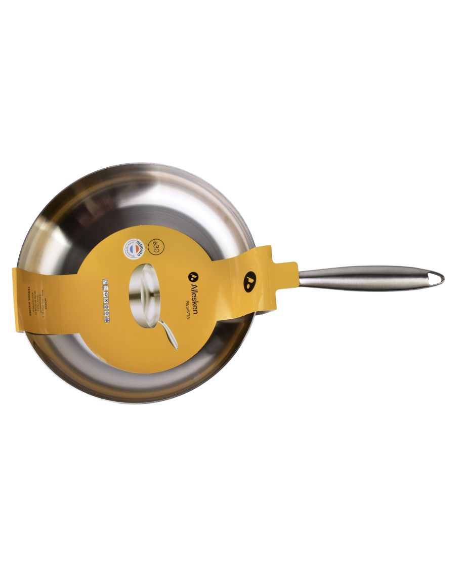 RESISTIA Patelnia stalowa 30cm z nowoczesnym designem marki Allesken.Patelnia RESISTIA o średnicy 30 cm to idealne rozwiązanie dla osób ceniących sobie elegancję oraz funkcjonalność w kuchni. Wykonana ze stali szlachetnej, łączy w sobie nowoczesny wygląd z doskonałą jakością wykonania, co sprawia, że każde gotowanie staje się przyjemnością.Kluczowe cechyWysokiej jakości stal nierdzewna zapewniająca trwałośćElegancki połysk, który przyciąga wzrokErgonomiczny kształt ułatwiający użytkowanieWiele zastosowań: od smażenia po duszenieŁatwość w czyszczeniu dzięki gładkiej powierzchniDlaczego warto wybrać kolekcję RESISTIASeria RESISTIA łączy w sobie nowoczesny design z funkcjonalnością, co czyni ją idealnym wyborem do każdej kuchni. Każda patelnia została starannie zaprojektowana z myślą o maksymalnym komforcie użytkowania. Elegancki połysk stali szlachetnej i ergonomiczny uchwyt sprawiają, że gotowanie staje się nie tylko łatwe, ale i estetyczne.Zastosowanie i pielęgnacjaPatelnię można używać na wszystkich typach kuchenek, w tym indukcyjnych. Zaleca się mycie ręczne, aby zachować jej oryginalny wygląd przez długi czas. Można używać lekko metalowych narzędzi kuchennych, ale należy unikać tych z ostrymi krawędziami, aby nie zarysować powierzchni.Dane techniczneWymiary 30x52x6cmMateriał stal nierdzewnaKolor srebrnyKompatybilność wszystkie typy kuchenekZapakowana w obejmę oraz jednostkowo w brązowy karton. Kluczowe zasady i ryzyka:. Wpływ na wykończenie: Regularne mycie w zmywarce może sprawić, że patelnia z czasem stanie się matowa lub pojawią się na niej przebarwienia.. Korozja i plamy: Agresywne detergenty w zmywarce mogą powodować powstawanie plam, a w skrajnych przypadkach piting (wżery).. Sól: Nie pozostawiaj resztek słonego jedzenia na patelni przed włożeniem do zmywarki, ponieważ może to prowadzić do korozji.. Delikatne mycie: Jeśli zmywarka jest konieczna, używaj łagodnych detergentów i unikaj długich, bardzo gorących cykl