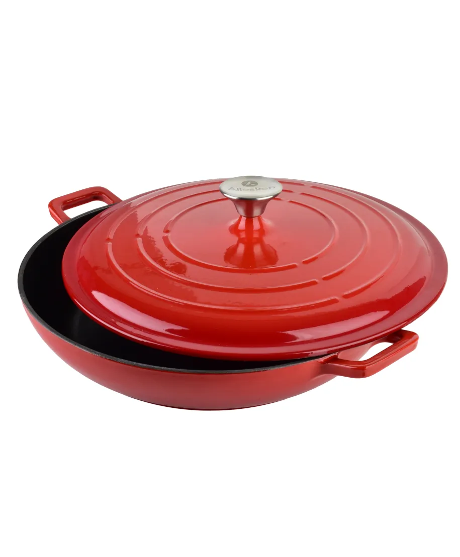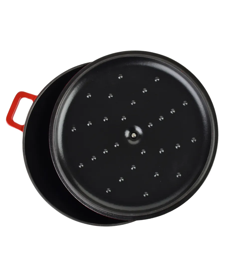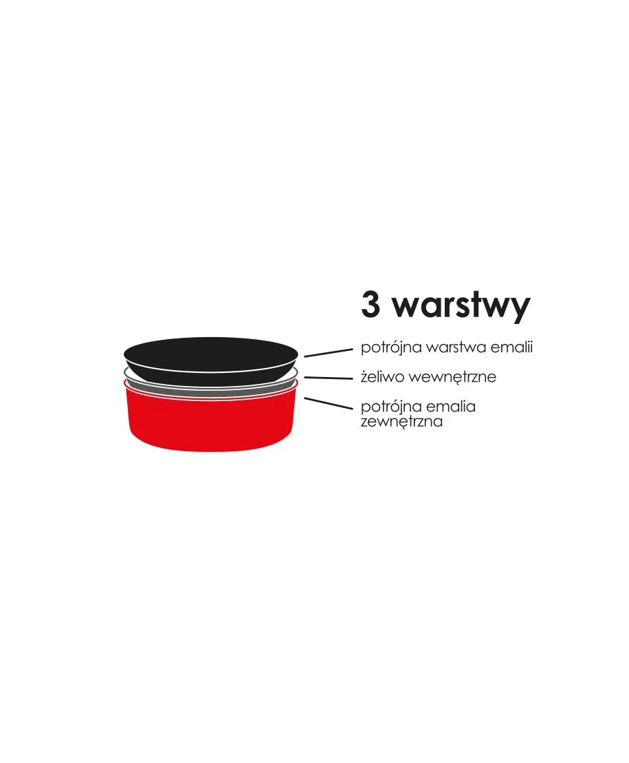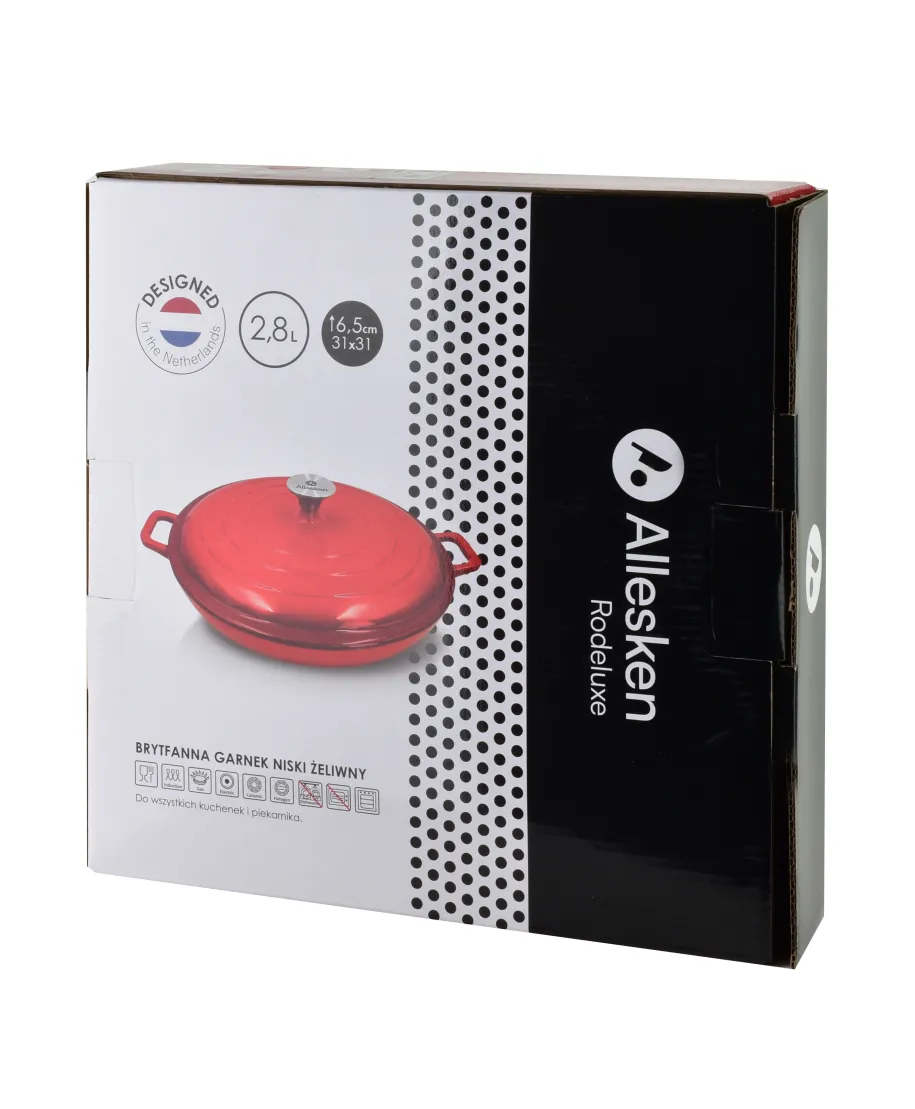 RODELUXE Brytfanna niska żeliwna emaliowana 31x31x6cm o pojemności 2,8L.Brytfanna żeliwna w kolorze czerwonym z serii RODELUXE to wysokiej jakości naczynie kuchenne, które jest idealne do przygotowywania różnorodnych potraw, w szczególności duszonych mięs, zapiekanek oraz pieczeni. Oto kilka cech charakterystycznych takiej gęsiarki: Materiał: Wykonana z solidnego żeliwa, które zapewnia równomierne rozprowadzanie ciepła oraz długotrwałe utrzymywanie temperatury. Kolor: Elegancki czerwony kolor, który dodaje stylu każdej kuchni. Pokrywa: Żeliwna pokrywa zapewniająca szczelność oraz optymalne warunki do duszenia potraw. Rączki: Ergonomiczne uchwyty ułatwiające przenoszenie naczynia, nawet gdy jestgorące. Seria RODELUXE: Charakteryzuje się wyjątkowym designem oraz najwyższą jakościąwykonania. Takie naczynie jest nie tylko funkcjonalne, ale również stanowi piękny element wyposażenia kuchni. Idealne dla miłośników gotowania, którzy cenią sobie trwałość i estetykę swoich narzędzi kuchennych.wymiar: 31x31xh6cm z pokrywą waga:5,5kg zapakowana jednostkowo w color box:33x33x8cm