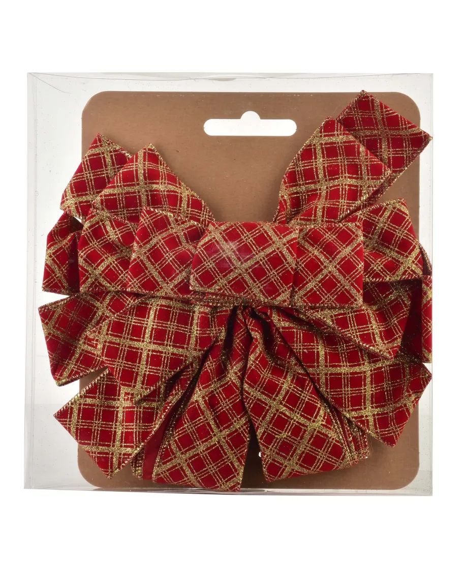 Kokarda SANTA LILA o wymiarach 32x130 cm wykonana z czerwonego welwetu w złotą kratę to wyrazista i elegancka dekoracja, która natychmiast przyciąga uwagę swoim klasycznym, a zarazem luksusowym wyglądem. Miękka, welwetowa tkanina nadaje jej głębi i ciepła, a złoty wzór w kratę dodaje blasku oraz świątecznego szyku. Umieszczona na czubku choinki stanowi efektowne zwieńczenie całej aranżacji, idealnie komponując się z dekoracjami w stylu tradycyjnym, glamour czy vintage. Staranne wykonanie z wysokiej jakości materiału gwarantuje trwałość i piękny wygląd kokardy przez wiele sezonów, wprowadzając do wnętrza atmosferę przytulnych, rodzinnych Świąt z nutą elegancji.