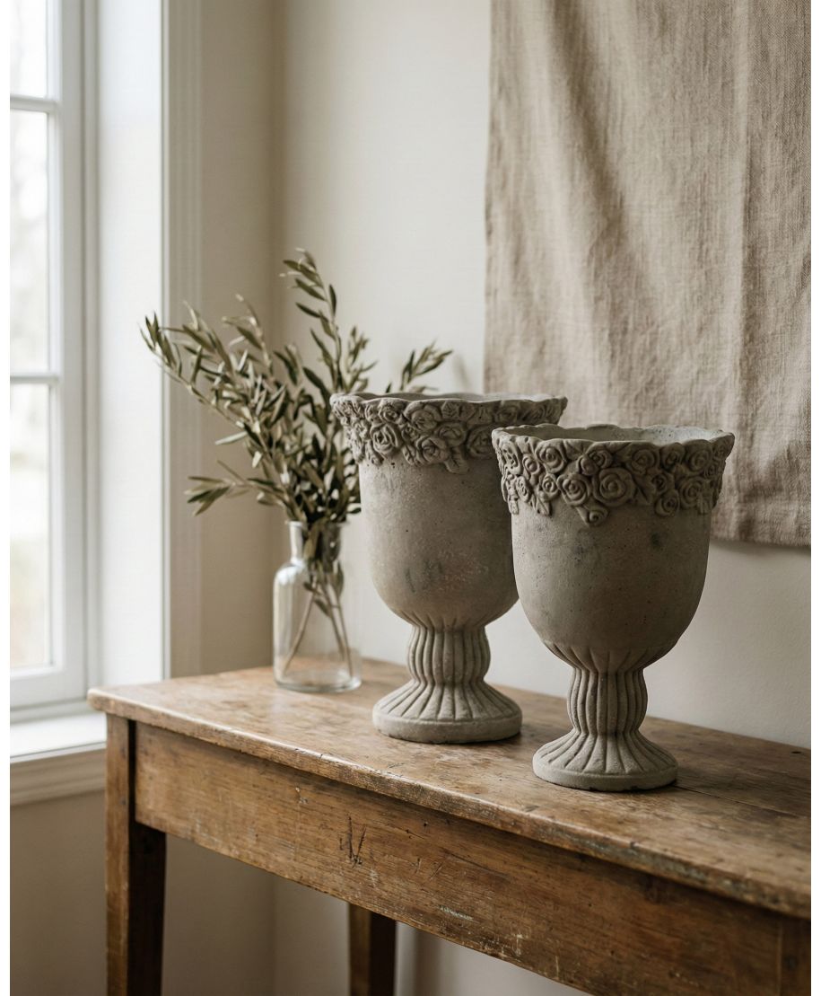 SIDI wazon kielich o wymiarach 28 28 39 cm, wykonany z wysokiej jakości gipsu ceramicznego w eleganckim odcieniu surowej szarości. Górna część wazonu zdobiona jest tłoczonymi różami, które nadają mu wyjątkowy, dekoracyjny charakter i wprowadzają subtelny, romantyczny akcent do przestrzeni.Wazon jest idealny jako efektowna dekoracja salonu, jadalni, holu czy tarasu, nadając wnętrzu lub przestrzeni zewnętrznej wyrafinowany styl. Solidna konstrukcja zapewnia stabilność, a gładka powierzchnia ułatwia czyszczenie i pielęgnację. Produkt nie jest mrozoodporny, dlatego w sezonie zimowym należy przechowywać go w suchym, zadaszonym miejscu. To doskonały wybór dla osób, które cenią eleganckie, dekoracyjne dodatki, łączące funkcjonalność z subtelnym designem.