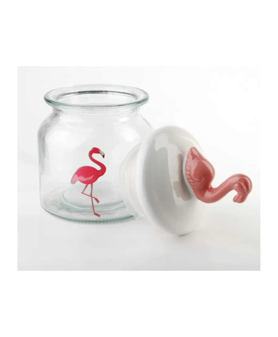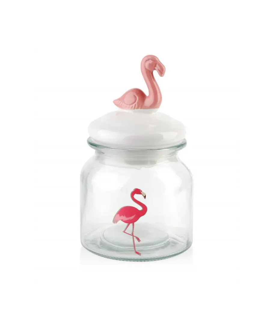 Słój wykonany ze szkła, posiada na przodzie kalkę z motywem flaminga.
