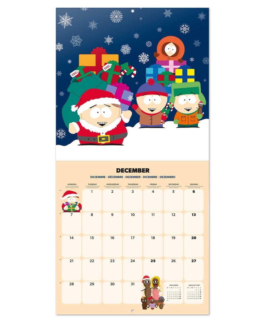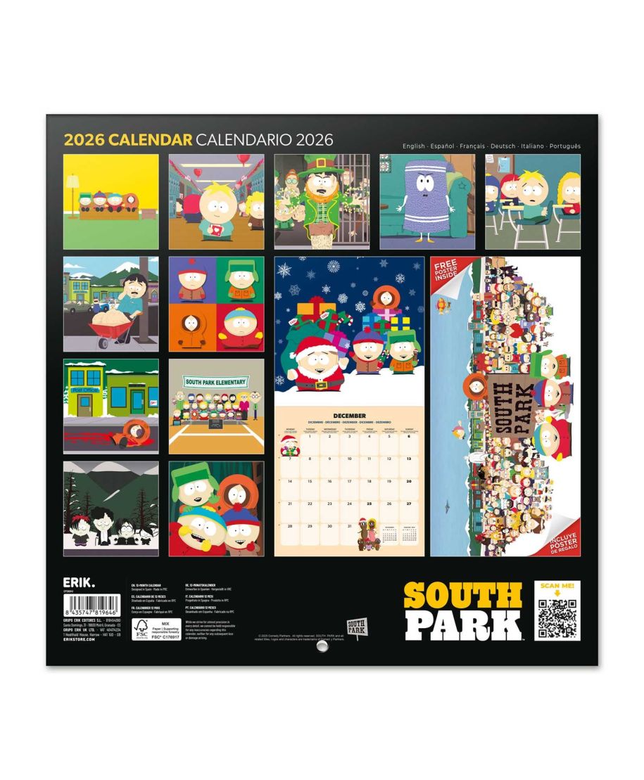 South Park oficjalny kalendarz na ścianę na 2026rok Oryginalny i licencjonowany kalendarz, posiada 12 rozkładanych stron o wymiarach 30x60 cm. Na każdej z kart znajduje się duża fotografiaoraz czytelne kalendarium z miejscem na notatki. W kalendarzu znajduje się 12 unikalnych zdjęć dla każdego miesiąca + plakat. Okładki wykonane są z papieru powlekanego matowego i laminowanego o gramaturze 250 g/m2, wnętrze z papieru powlekanego matowego o gramaturze 150 g/m2. Nagłówki są w 6 językach:angielski, hiszpański, francuski, włoski, niemiecki i portugalski. Oprawa zszywkowa. Złożony kalendarz 30x30 cm. Rozłożony kalendarz 30x60 cm. Zawiera otwór 5 mm do zawieszenia na ścianie.