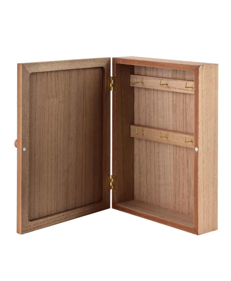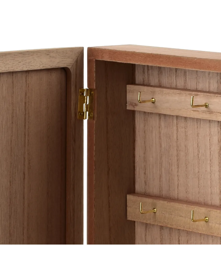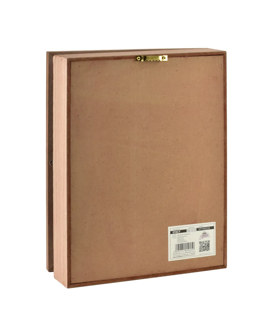 Skrzynka na klucze STACY o wymiarach 26x20x5,5 cm to elegancki drewniany element wyposażenia, wyróżniający się wyciętym okienkiem w marokański wzór. To połączenie tradycyjnego designu z subtelnymi, etnicznymi akcentami, które nadają jej wyjątkowego charakteru. Wnętrze skrzynki zawiera sześć praktycznych wieszaków, idealnych do przechowywania kluczy, breloczków i innych drobnych przedmiotów. Dzięki marokańskiemu wzorowi, skrzynka staje się nie tylko funkcjonalnym, ale i dekoracyjnym dodatkiem do wnętrz w stylu boho, orientalnym lub klasycznym. Jej drewniane wykończenie zapewnia ciepło i naturalny wygląd, doskonale pasujący do przedpokoju, sypialni czy biura.