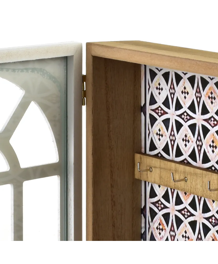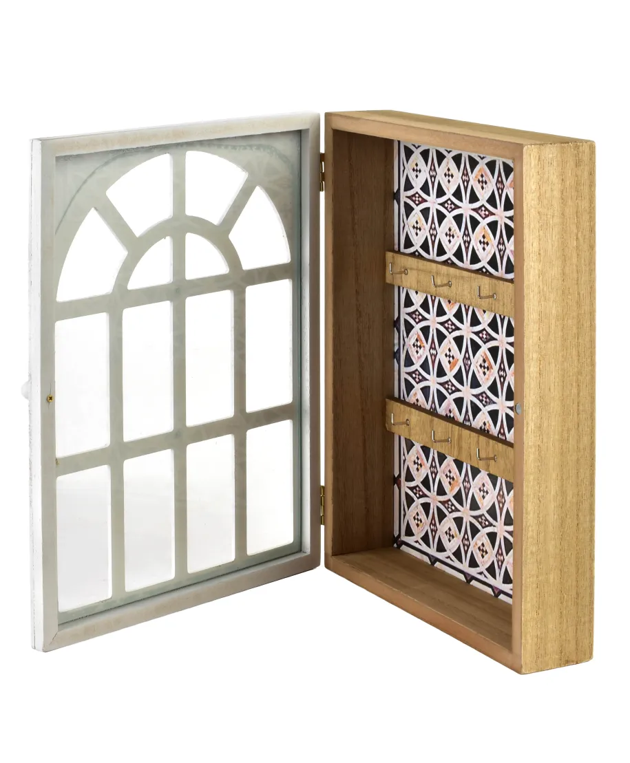 Skrzynka na klucze STACY o wymiarach 28x21,5x6 cm w kolorze białym, inspirowana starodawnym oknem łukowym, to elegancki i unikalny element wystroju. Jej kształt i wykończenie imitują klasyczne okno z charakterystycznymi szprosami, nadając jej subtelny, vintageowy wygląd. Wnętrze skrzynki zostało ozdobione przepięknym marokańskim tłem, które dodaje jej egzotycznego, artystycznego uroku. Została wyposażona w sześć wieszaków, idealnych do przechowywania kluczy, breloczków i innych drobiazgów. Biała kolorystyka i stylowy design sprawiają, że skrzynka doskonale komponuje się w różnych aranżacjach wnętrz, od klasycznych po te inspirowane stylem boho czy marokańskim. To połączenie funkcjonalności z wyjątkową estetyką, które wprowadza do przestrzeni ciepło i elegancję. Idealna do przedpokoju, salonu lub nawet sypialni.