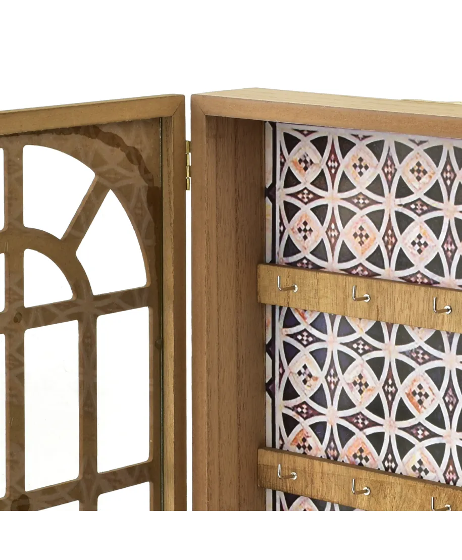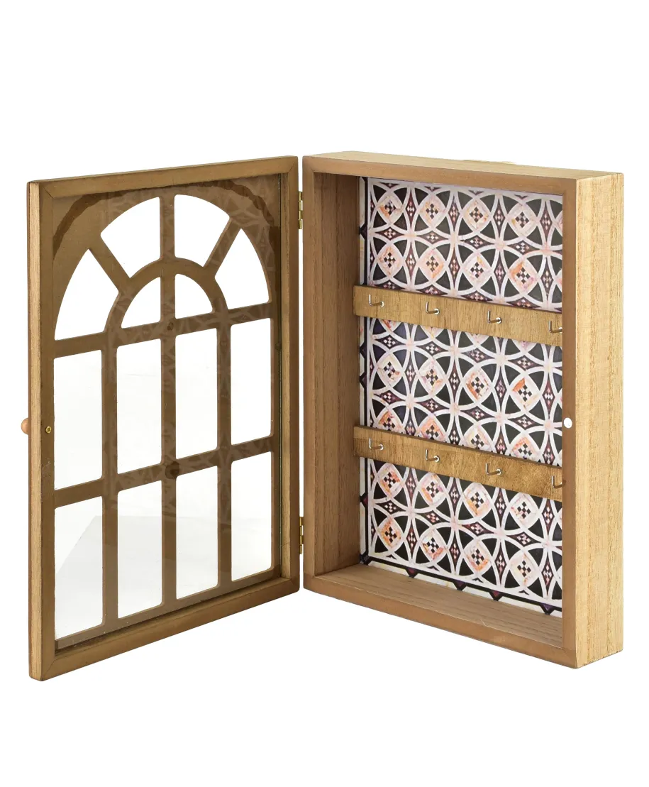 Skrzynka na klucze STACY. Jest to funkcjonalny i stylowy produkt, który nie tylko pełni swoją rolę praktyczną, ale także może być ozdobą wnętrza. Opis sugeruje, że ma:Wymiary: 28x21x5,5 cm, co sprawia, że jest dość kompaktowa, ale wystarczająca do przechowywania kilku kluczy.Okienko łukowe ze szprosami: To nadaje jej bardziej elegancki i vintage.owy wygląd, a szprosy nadają charakterystyczny, klasyczny akcent.Kolor drewna naturalny: Styl drewna naturalnego pasuje do wielu typów wnętrz, zwłaszcza tych urządzonych w klasycznym, rustykalnym lub skandynawskim stylu.6 wieszaków: Wystarczająco dużo miejsca na klucze i inne drobiazgi.Tło z wzorem marokańskim: To ciekawy detal, który dodaje skrzynce nieco orientalnego charakteru