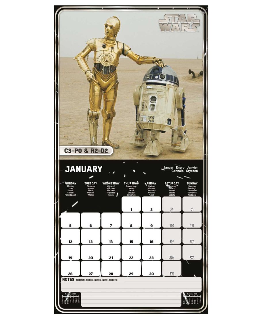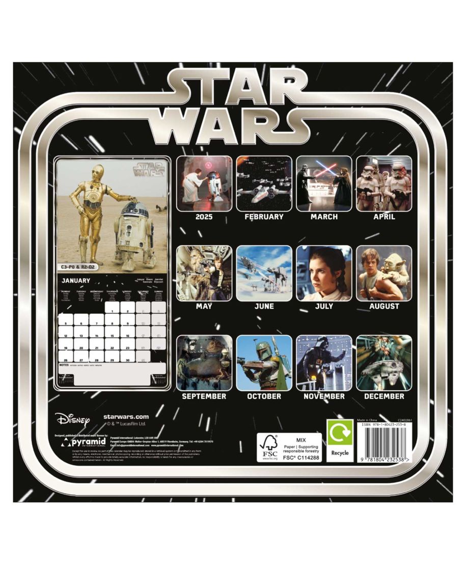Star Wars oficjalny kalendarz na ścianę na 2026 rok Numer katalogowy: C2402861 Producent: Pyramid International Oryginalny i licencjonowany kalendarz, posiada 12 rozkładanych stron o wymiarach 30x60 cm. Na każdej z kart znajduje się duża fotografia oraz czytelne kalendarium z miejscem na notatki. W kalendarzu znajduje się 12 unikalnych zdjęć dla każdego miesiąca. Okładki wykonane są z papieru powlekanego matowego i laminowanego o gramaturze 250 g/m2, wnętrze z papieru powlekanego matowego o gramaturze 150 g/m2. Nagłówki są w 6 językach: angielski, hiszpański, francuski, włoski, niemiecki i polski. Oprawa zszywkowa. Złożony kalendarz 30x30 cm. Rozłożony kalendarz 30x60 cm. Zawiera otwór 5 mm do zawieszenia na ścianie.