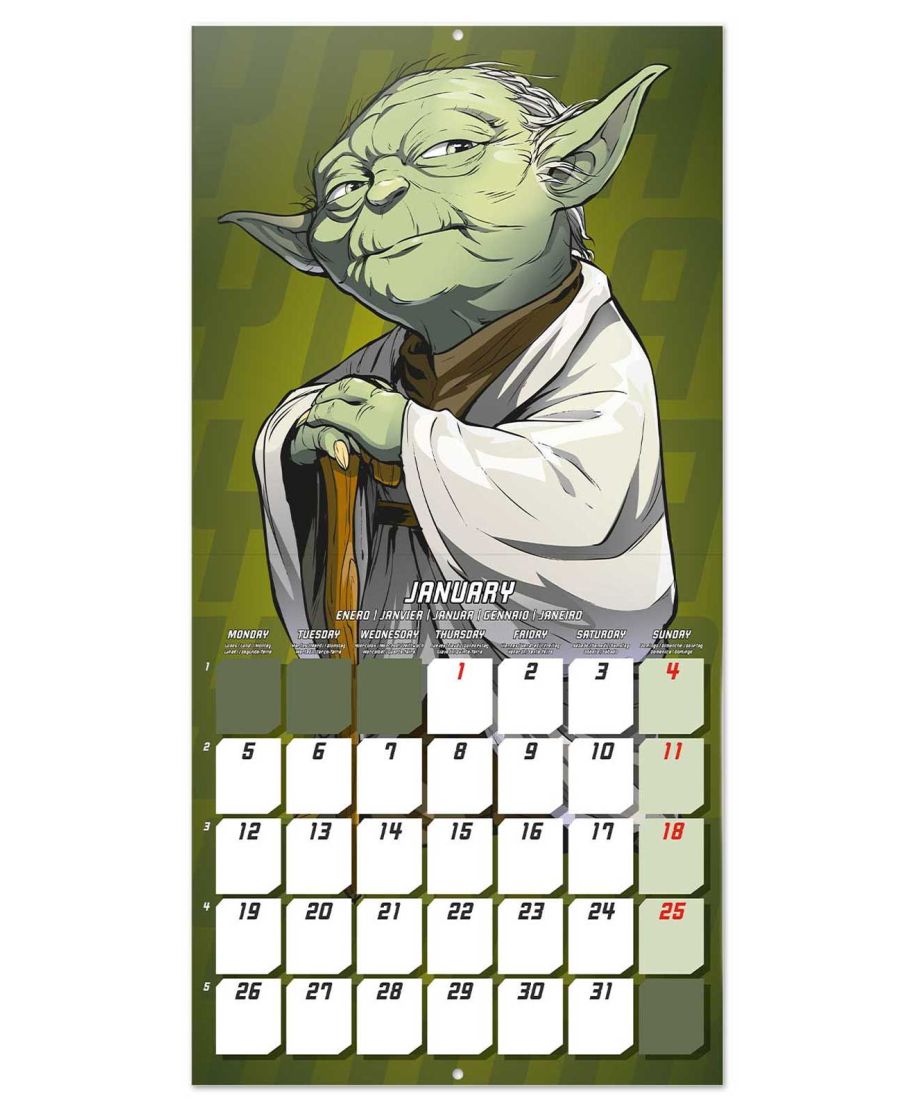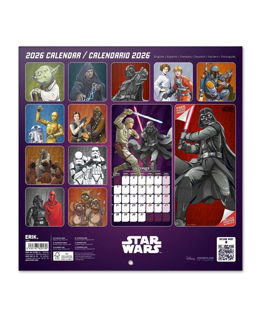 Star Wars oficjalny kalendarz na ścianę na 2026rok Oryginalny i licencjonowany kalendarz, posiada 12 rozkładanych stron o wymiarach 30x60 cm. Na każdej z kart znajduje się duża fotografiaoraz czytelne kalendarium z miejscem na notatki. W kalendarzu znajduje się 12 unikalnych zdjęć dla każdego miesiąca + plakat. Okładki wykonane są z papieru powlekanego matowego i laminowanego o gramaturze 250 g/m2, wnętrze z papieru powlekanego matowego o gramaturze 150 g/m2. Nagłówki są w 6 językach:angielski, hiszpański, francuski, włoski, niemiecki i portugalski. Oprawa zszywkowa. Złożony kalendarz 30x30 cm. Rozłożony kalendarz 30x60 cm. Zawiera otwór 5 mm do zawieszenia na ścianie.