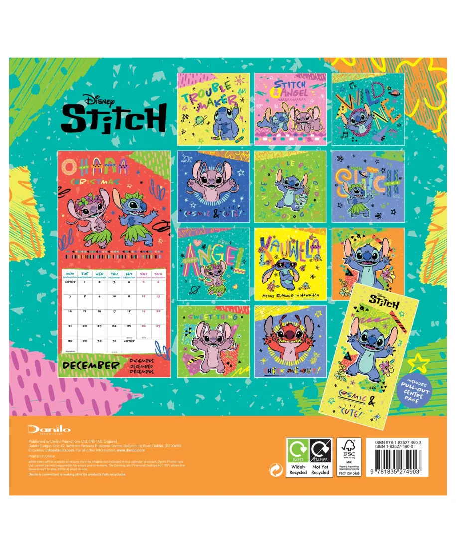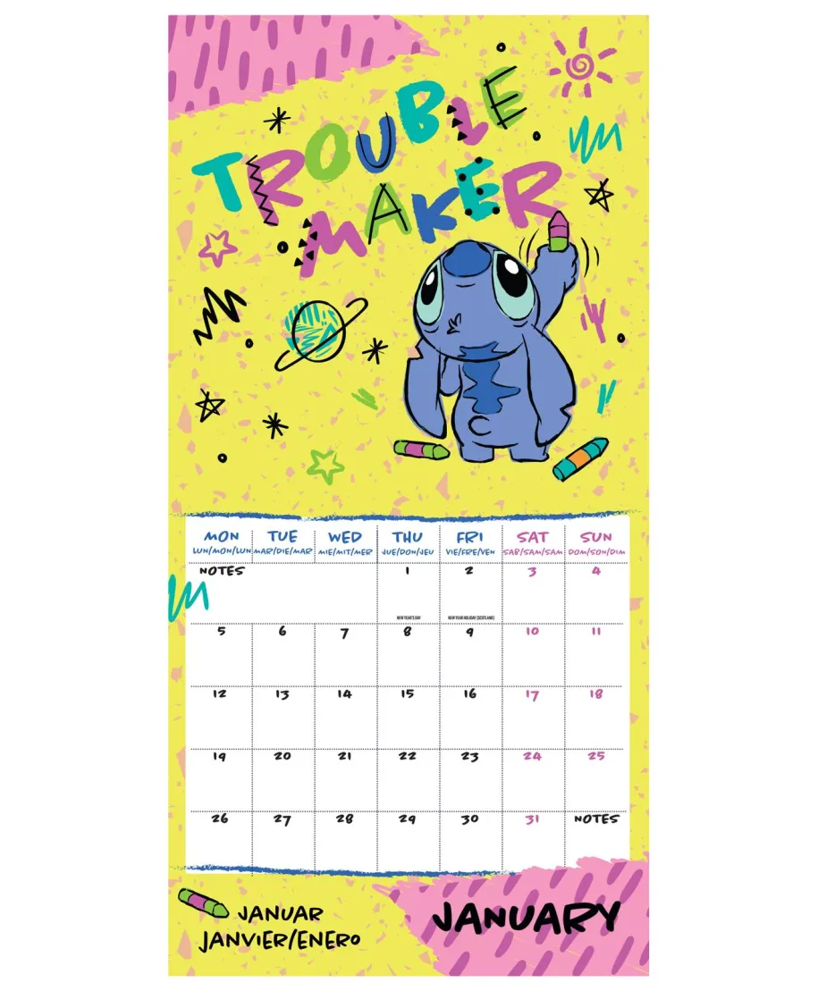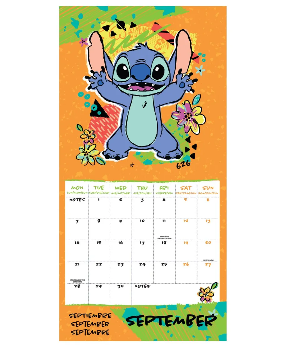 Stitch oficjalny kalendarz na ścianę na 2026rok Oryginalny i licencjonowany kalendarz, posiada 12 rozkładanych stron o wymiarach 30x60 cm. Na każdej z kart znajduje się duża fotografiaoraz czytelne kalendarium z miejscem na notatki. W kalendarzu znajduje się 12 unikalnych zdjęć dla każdego miesiąca. Okładki wykonane są z papieru powlekanego matowego i laminowanego o gramaturze 250 g/m?, wnętrze z papieru powlekanego matowego o gramaturze 150 g/m?. Nagłówki są wjęzykach: angielskim, francuskim, hiszpańskim i niemieckim. Oprawa zszywkowa. Złożony kalendarz 30x30 cm. Rozłożony kalendarz 30x60 cm. Zawiera otwór 5 mm do zawieszenia na ścianie.
