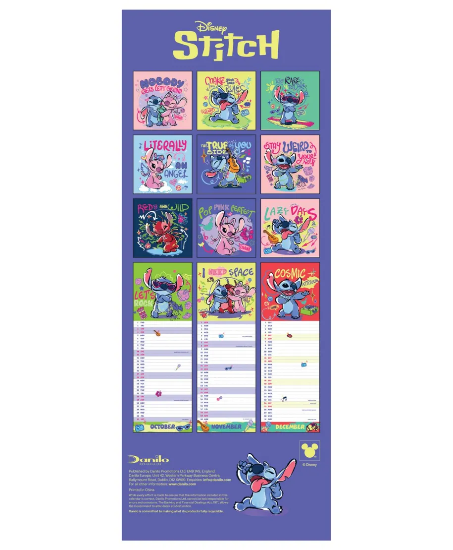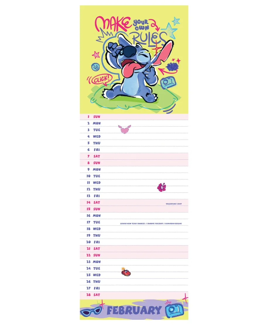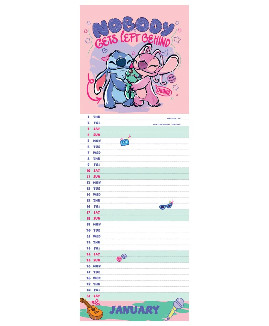 Stitch oficjalny kalendarz na ścianę na 2026 rok w wersji slim Oryginalny i licencjonowany kalendarz, posiada 12 rozkładanych stron o wymiarach 14x42 cm. Na każdej z kart znajduje się urocza ilustracja Stitcha oraz czytelne kalendarium z miejscem na notatki. W kalendarzu znajduje się 12 unikalnych grafik z bohaterem Disneya, które wniosą odrobinę magii do codzienności. Okładki i wnętrze wykonane są z wysokiej jakości papieru w wersji ekologicznej, wolnej od plastiku. Nagłówki są w języku angielskim. Oprawa zszywkowa. Format slim 14x42 cm. 12 miesięcznych stron + okładka. Zawiera otwór 5 mm do zawieszenia na ścianie.