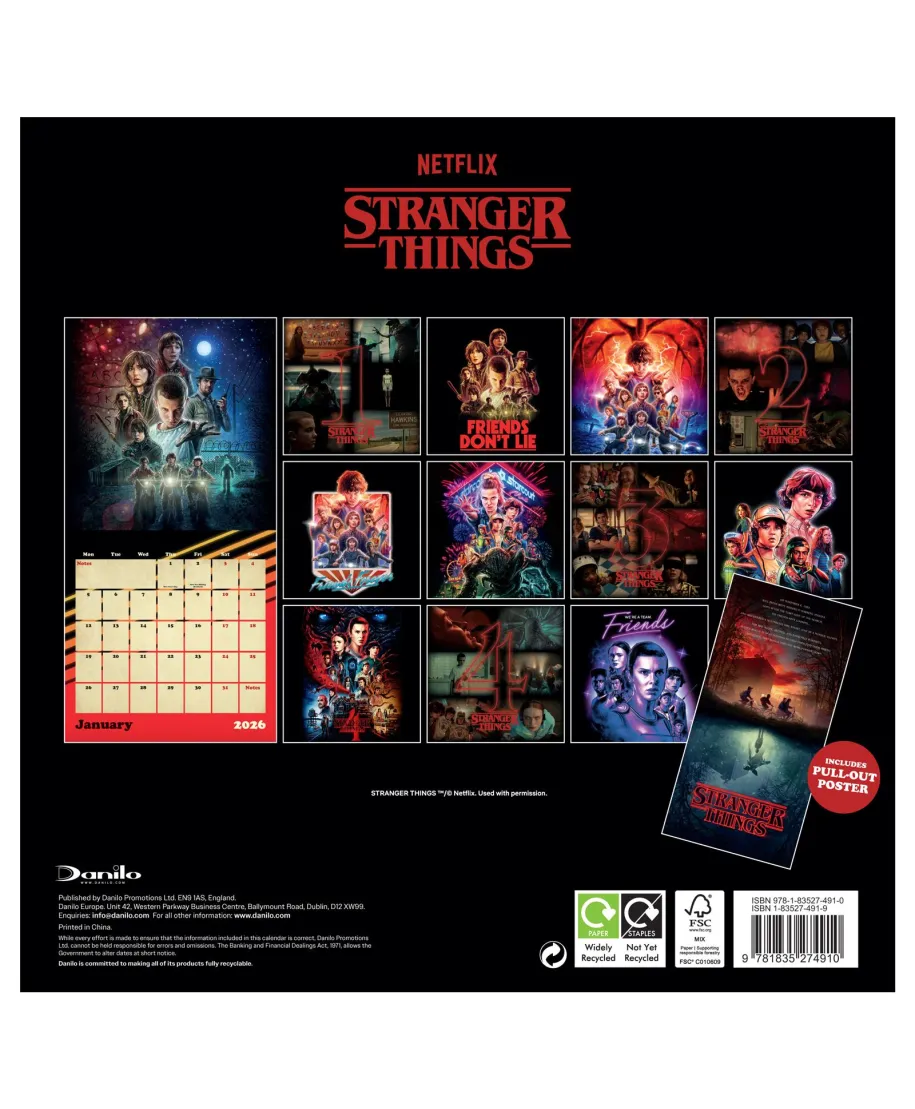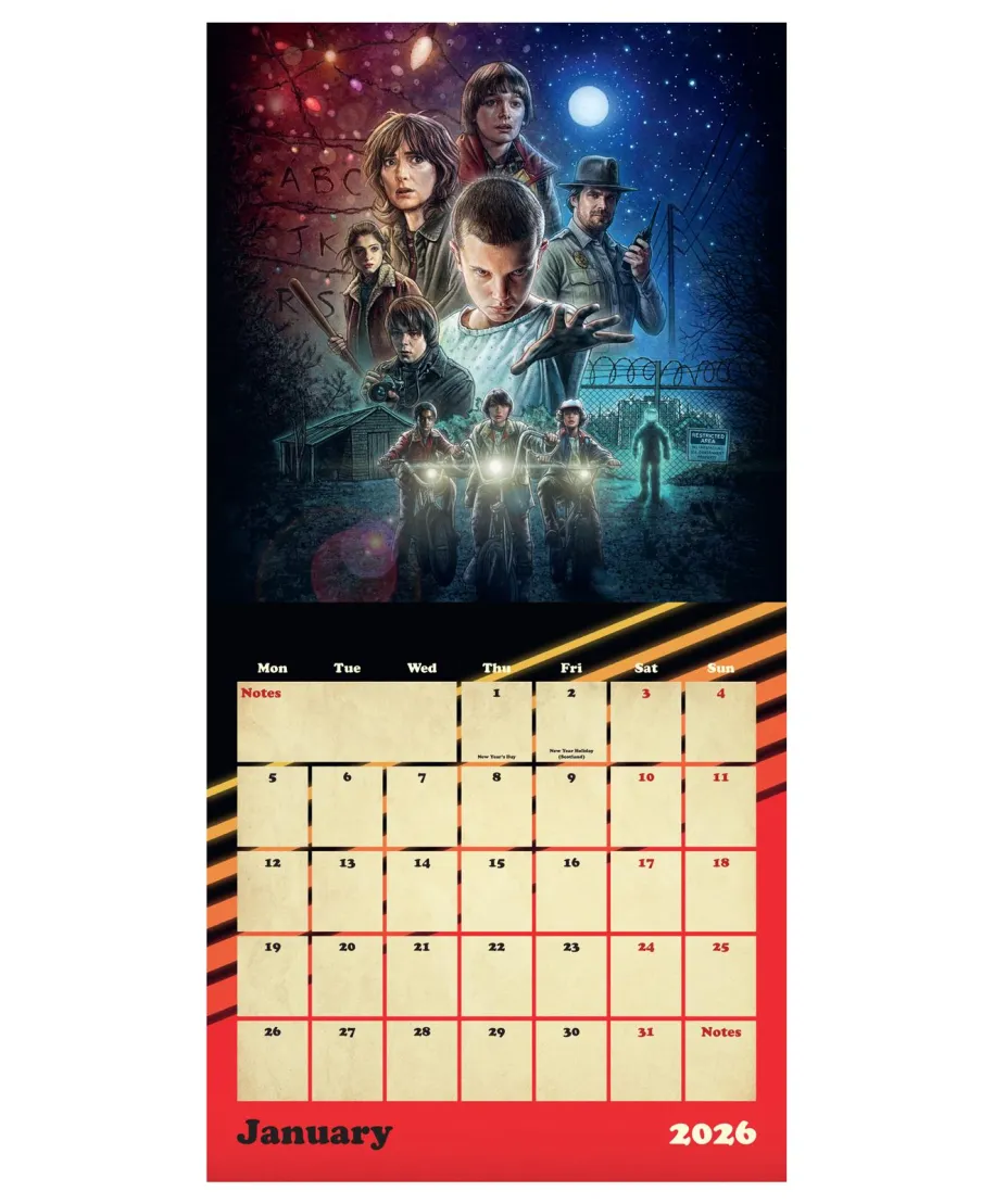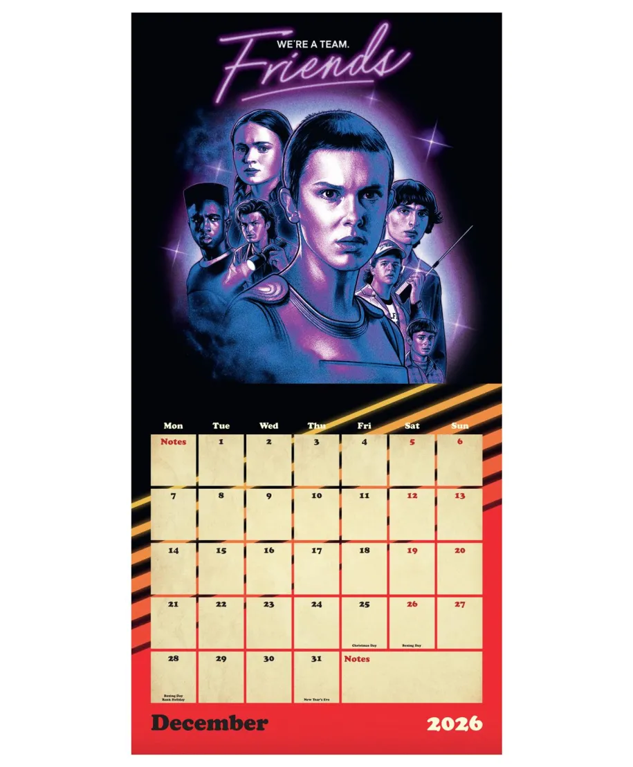 Stranger Things oficjalny kalendarz na ścianę na 2026rok Oryginalny i licencjonowany kalendarz, posiada 12 rozkładanych stron o wymiarach 30x60 cm. Na każdej z kart znajduje się duża fotografiaoraz czytelne kalendarium z miejscem na notatki. W kalendarzu znajduje się 12 unikalnych zdjęć dla każdego miesiąca. Okładki wykonane są z papieru powlekanego matowego i laminowanego o gramaturze 250 g/m?, wnętrze z papieru powlekanego matowego o gramaturze 150 g/m?. Nagłówki są w języku angielskim. Oprawa zszywkowa. Złożony kalendarz 30x30 cm. Rozłożony kalendarz 30x60 cm. Zawiera otwór 5 mm do zawieszenia na ścianie.