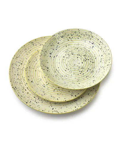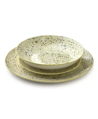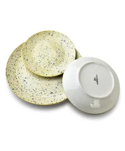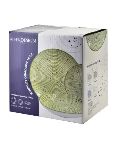 Porcelanowy komplet 18 elementowy z serii STRIPES BEIGE. STRIPES BEIGE - porcelanowy komplet, który łączy styl i funkcjonalność. Wprowadź świeżość i elegancję do swojej jadalni dzięki 18-elementowemu zestawowi z serii STRIPES BEIGE. Ten nowoczesny komplet porcelanowy nie tylko zachwyca subtelnym, zielonym wzorem, ale również oferuje wygodę codziennego użytkowania. Dlaczego warto wybrać STRIPES BEIGE? Delikatne beżowe paski dodają naczyniom lekkości i naturalnego uroku. Idealnie komponują się z wnętrzami nowoczesnymi, skandynawskimii klasycznymi. Komfort użytkowania. Komplet jest przystosowany do zmywarki i kuchenki mikrofalowej, co oszczędza Twój czas i ułatwia codzienne obowiązki. Wytrzymałość i niezawodność. Porcelana wysokiej jakości gwarantuje odporność na uszkodzenia i zarysowania, dzięki czemu zestaw doskonale sprawdza się podczas codziennych posiłków.Komplet na każdą okazję . 18 elementów umożliwia wygodne serwowanie posiłków dla całej rodziny, zarówno podczas codziennego śniadania, jak i niedzielnego obiadu.To naczynia, które posłużą przez lata, nie tracąc swojego uroku ani funkcjonalności. wymiary: talerz obiadowy x6szt - 27cm x 3cm talerz deserowy x6szt - 19cm x 1,5cm miska talerz polski x6szt - 20cm x 4cm poj.550ml waga całego zetsawu: 9,5kg/10kg z color box wymiar color box: 21x21x27cm