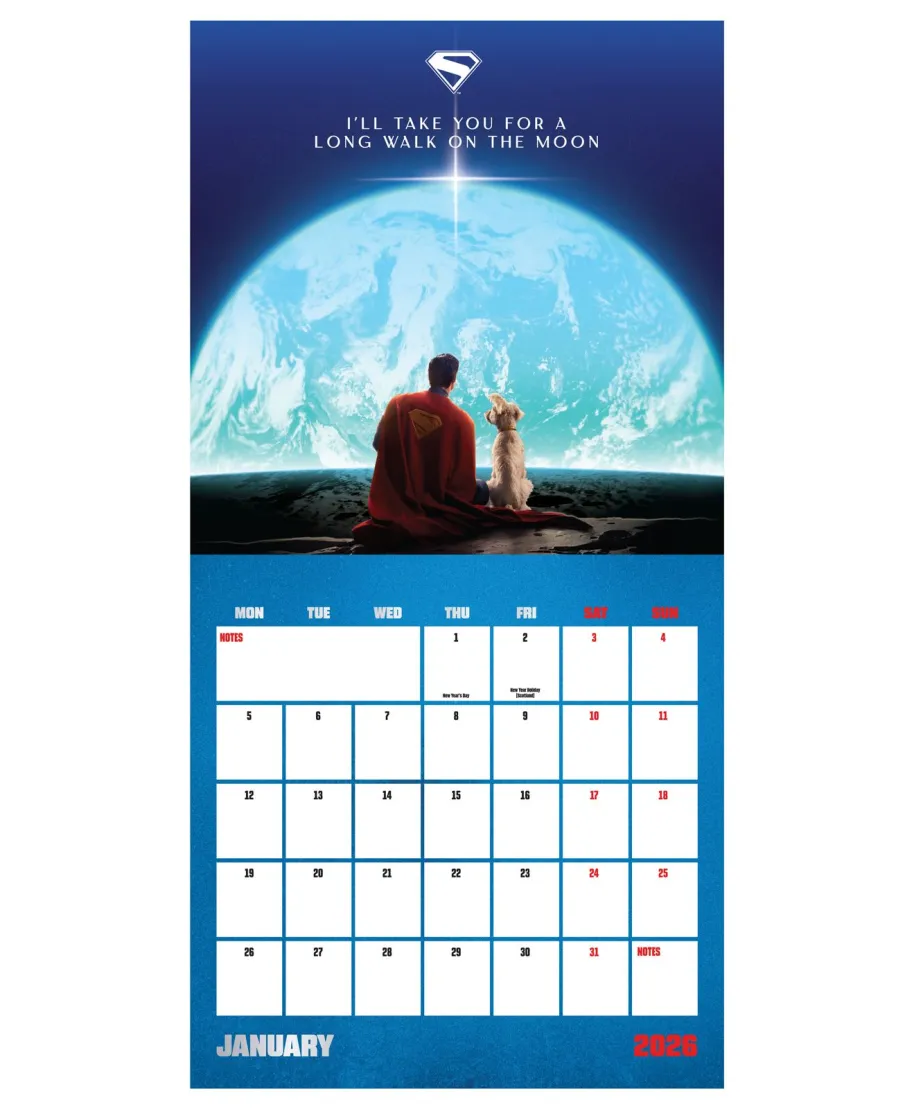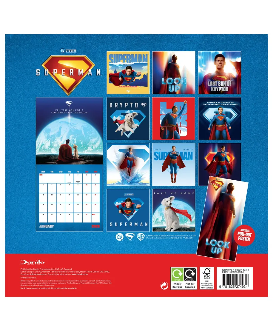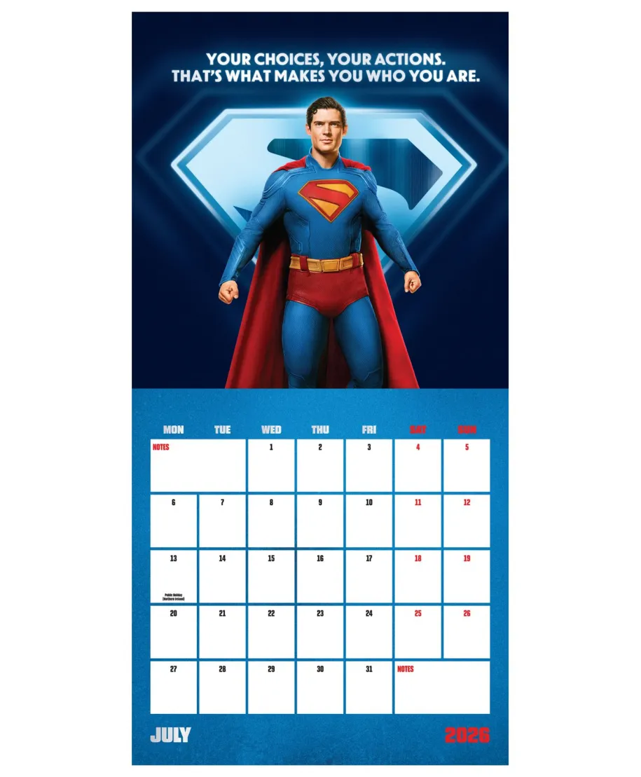 Superman oficjalny kalendarz na ścianę na 2026rok Oryginalny i licencjonowany kalendarz, posiada 12 rozkładanych stron o wymiarach 30x60 cm. Na każdej z kart znajduje się duża fotografiaoraz czytelne kalendarium z miejscem na notatki. W kalendarzu znajduje się 12 unikalnych zdjęć dla każdego miesiąca + plakat. Okładki wykonane są z papieru powlekanego matowego i laminowanego o gramaturze 250 g/m?, wnętrze z papieru powlekanego matowego o gramaturze 150 g/m?. Nagłówki są w języku angielskim. Oprawa zszywkowa. Złożony kalendarz 30x30 cm. Rozłożony kalendarz 30x60 cm. Zawiera otwór 5 mm do zawieszenia na ścianie.