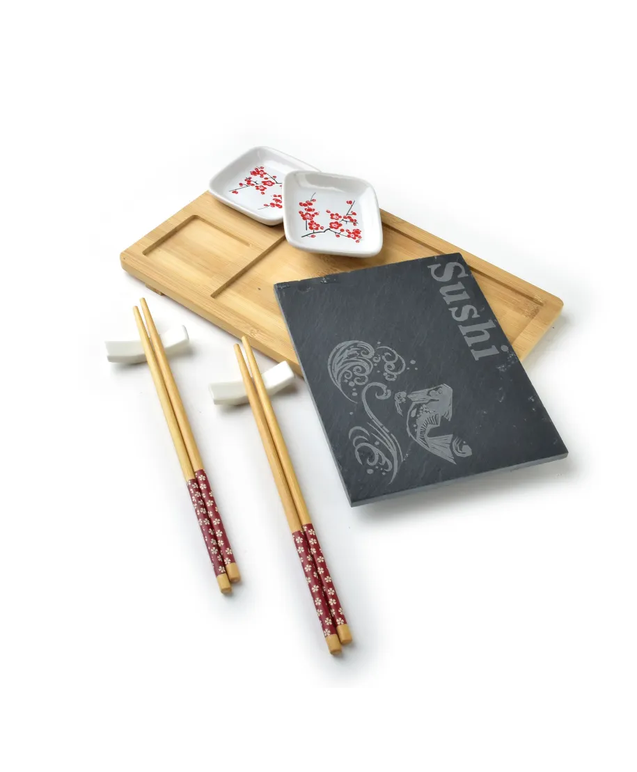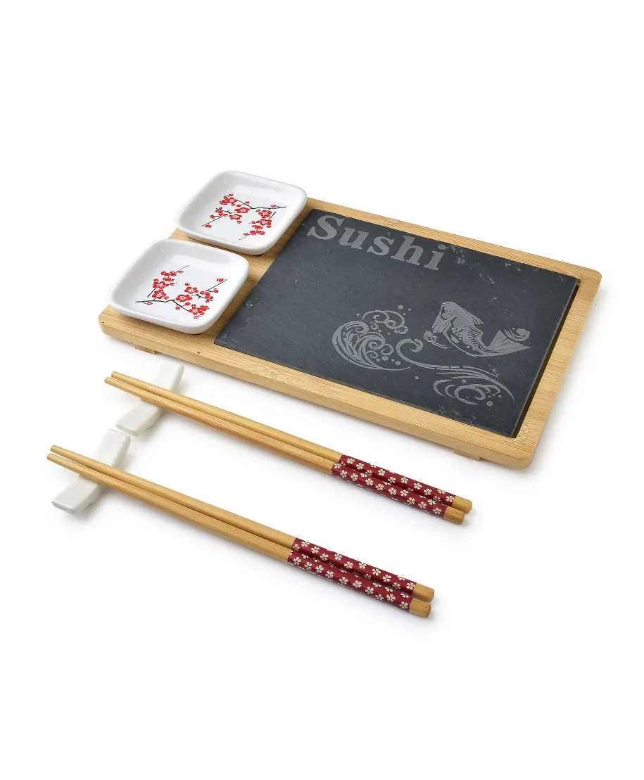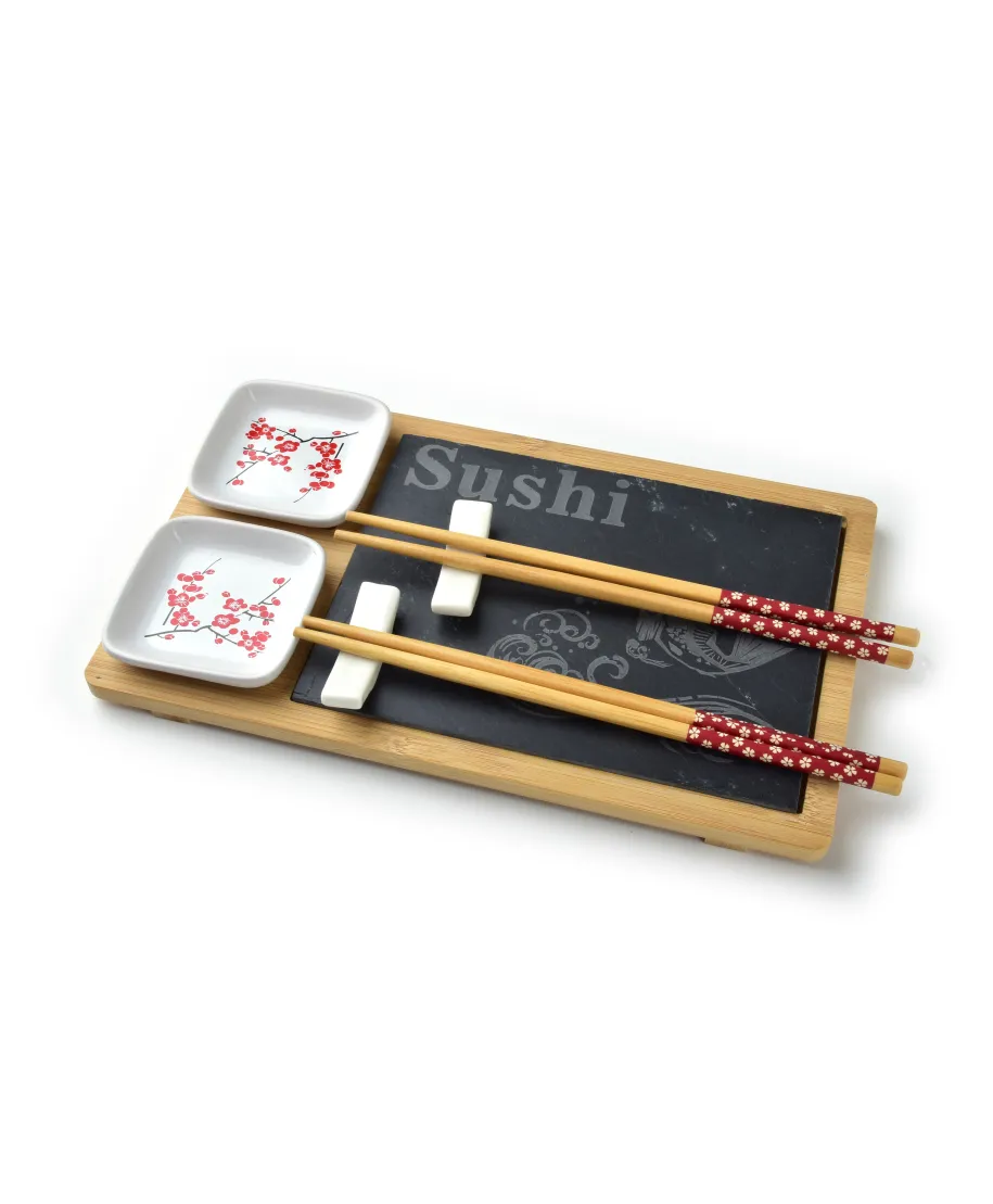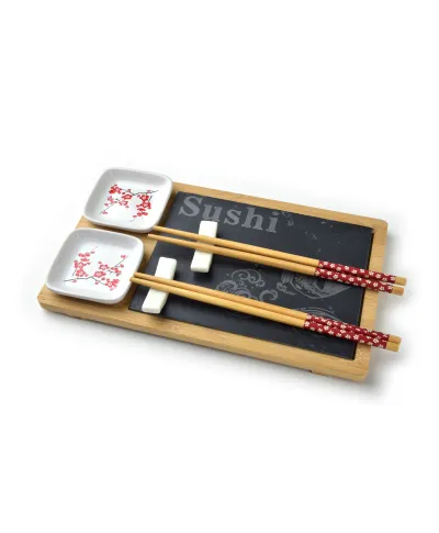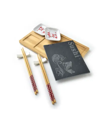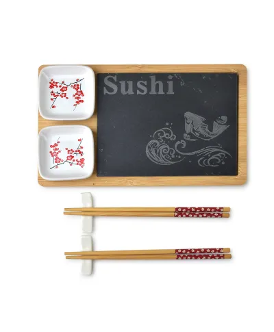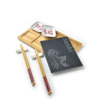 Przenieś się do autentycznej japońskiej restauracji we własnym domu dzięki naszemu zestawowi do sushi dla dwóch osób. Ten elegancki zestaw zawiera wszystko, czego potrzebujesz, aby cieszyć się pysznym sushi w komfortowych warunkach, zachowując przy tym tradycyjny charakter i styl japońskiej kuchni.\Co znajdziesz w zestawie?\\drewniana deska: idealna do serwowania sushi, wykonana z wysokiej jakości drewna, która dodaje naturalnego, eleganckiego wyglądu i jest łatwa w czyszczeniu.\deska z łupka: doskonała alternatywa dla drewnianej deski, dodająca nowoczesnego akcentu i pozwalająca na wyjątkową prezentację Twoich kulinarnych arcydzieł.\dwa komplety pałeczek: wykonane z trwałych materiałów, zapewniają wygodę i styl podczas jedzenia. każdy zestaw jest indywidualnie zdobiony, co dodaje uroku i elegancji.\dwie miseczki: idealne do sosu sojowego, wasabi czy imbiru, wykonane z wysokiej jakości ceramiki, która doskonale komponuje się z resztą zestawu.\dwie podkładki pod pałeczki: zapewniają, że pałeczki są zawsze na swoim miejscu, dodając estetyki i funkcjonalności podczas posiłku.\\Korzyści z zakupu naszego zestawu:\\elegancja i styl: każdy element zestawu został starannie zaprojektowany, aby dodać klasy i elegancji do Twoich posiłków. niezależnie od okazji, nasz zestaw do sushi sprawi, że każde danie stanie się wyjątkowe.\kompletność: nie musisz martwić się o dodatkowe akcesoria. nasz zestaw zawiera wszystko, czego potrzebujesz, aby w pełni cieszyć się sushi w domowym zaciszu.\łatwość użytkowania i czyszczenia: wszystkie elementy zestawu są łatwe w czyszczeniu i konserwacji, co pozwala na szybkie i bezproblemowe przygotowanie oraz sprzątanie po posiłku.\zestaw jest pakowany w pudełko, co czyni go idealnym prezentem na każdą okazję . od urodzin po rocznicę.\\Zapewnij sobie i swojej bliskiej osobie wyjątkowe doświadczenie kulinarne dzięki naszemu zestawowi do sushi dla dwóch osób. Ciesz się autentycznym smakiem Japonii bez wychodzenia z domu!\\Wymiary:\\deska drewniana: 30x18xh1,5cm\\deska łupek: 20x15xh0,5cm\\miseczka: 8x8cm\\pałeczki: 24cm\\Produkt sprzedawany w zestawie: 2 komplety pałeczek, 2 miseczki, deska drewniania,\deska łupek, 2 podstawki pod pałeczki.\