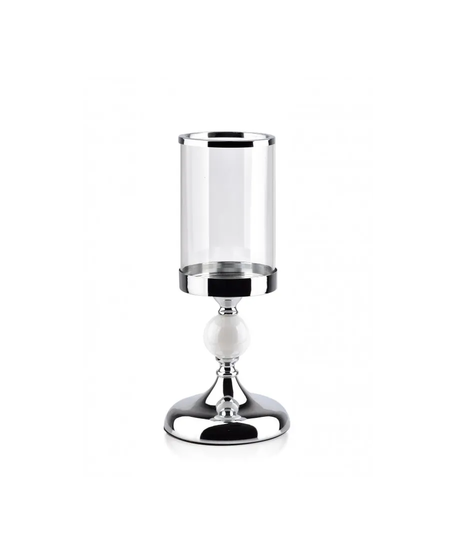 Elegancki świecznik - lampion z serii CHANTAL. Składa się z dwóch części: zdobionej nogi z białą kulą oraz szklanego klosza. Srebrny świecznik to idealne rozwiązanie do każdego wnętrza. Znajdzie on swoje zastosowanie jako ozdoba pokoju dziennego, salonu c