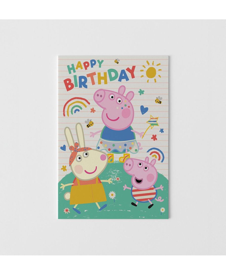 Świnka Peppa - kartka urodzinowa z melodyjką Kartka Świnka Peppa z melodyjką to produkt stworzony z myślą o najmłodszych. Kolorowa grafika z Peppą i Georgeem oraz muzyczna niespodzianka po otwarciu kartki sprawiają, że jest to atrakcyjny dodatek do prezentu urodzinowego. Nadrukowane życzenia wewnątrz czynią produkt gotowym do wręczenia. Szczegóły produktu: Format: 15 x 23 cm Motyw: Świnka Peppa (Peppa Pig) Bohaterowie: Peppa, George Dodatki: melodyjka po otwarciu Wnętrze: z nadrukowanymi życzeniami Oficjalny produkt z licencją Licencjonowana kartka Peppa Pig - oryginalny produkt idealny dla dzieci, chętnie wybierany do sprzedaży urodzinowej.