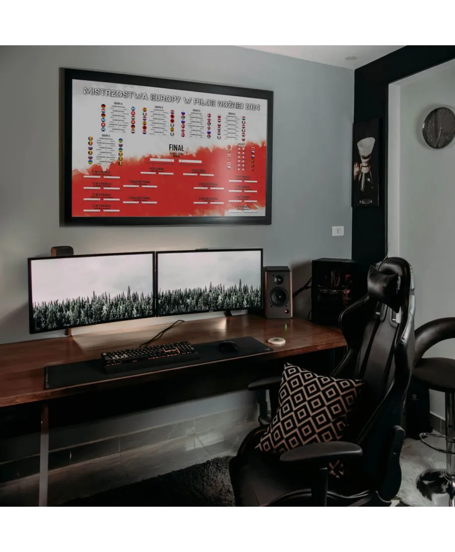 Tabela Euro 2024 terminarz rozgrywek na plakacie Plakat z tabelą rozgrywek wszystkich 51 meczy na EURO 2024, które odbędzie się w Niemczech. Pierwszy mecz rozegra się 14 czerwca na Stadionie Allianz Arena w Monachium. Reprezentacja Polski ma przed sobą 3 mecze w grupie D: Polska – Holandia, 16 czerwca o 15:00 Polska – Austria, 21 czerwca o 18:00 Polska – Francja, 25 czerwca o 18:00 Szczegóły techniczne: Gramatura papieru: 200g/m2. Wymiary tabeli: 91,5x61 cm. Druk: cyfrowy Marka: Nice Wall