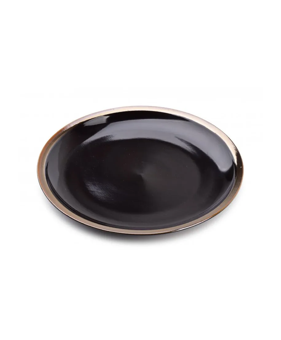 Talerz porcelanowy z serii CAL. Zdobienie jest wykonane ręcznie w kolorze postarzanego złota. Pasek może się różnić na poszczególnych produktach. Nie należy myć w zmywarce.