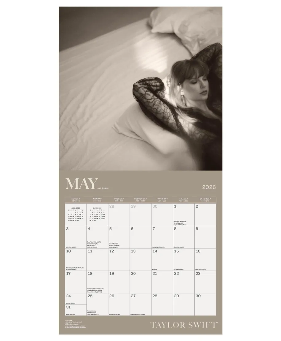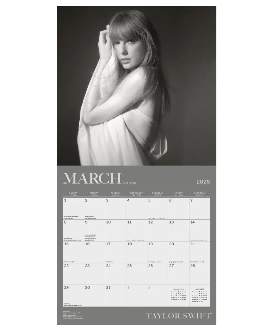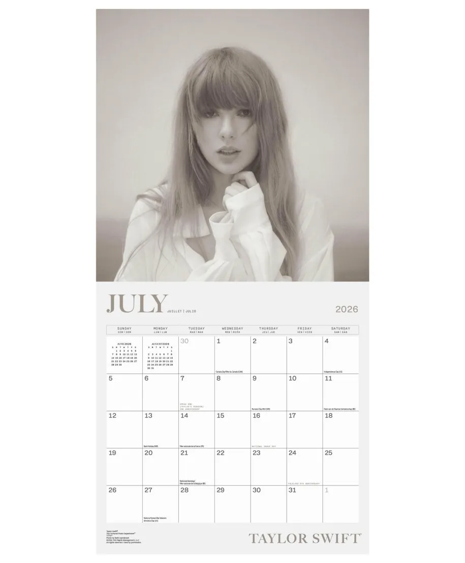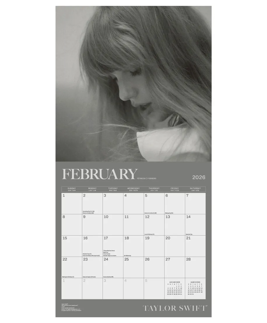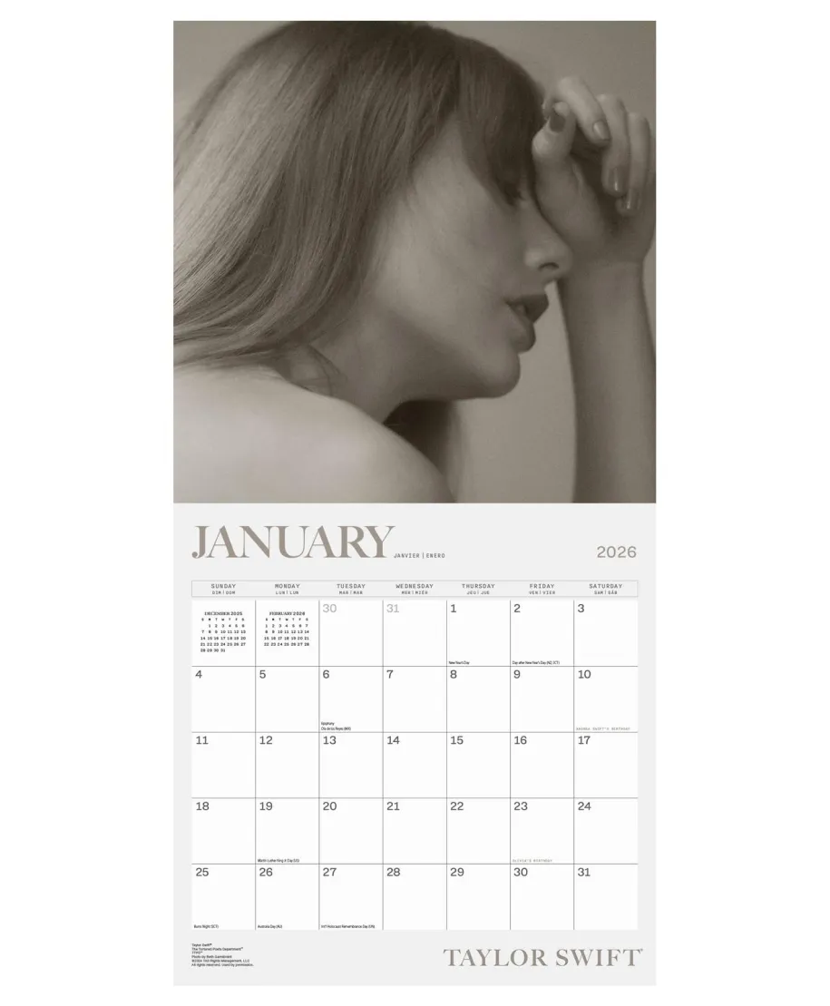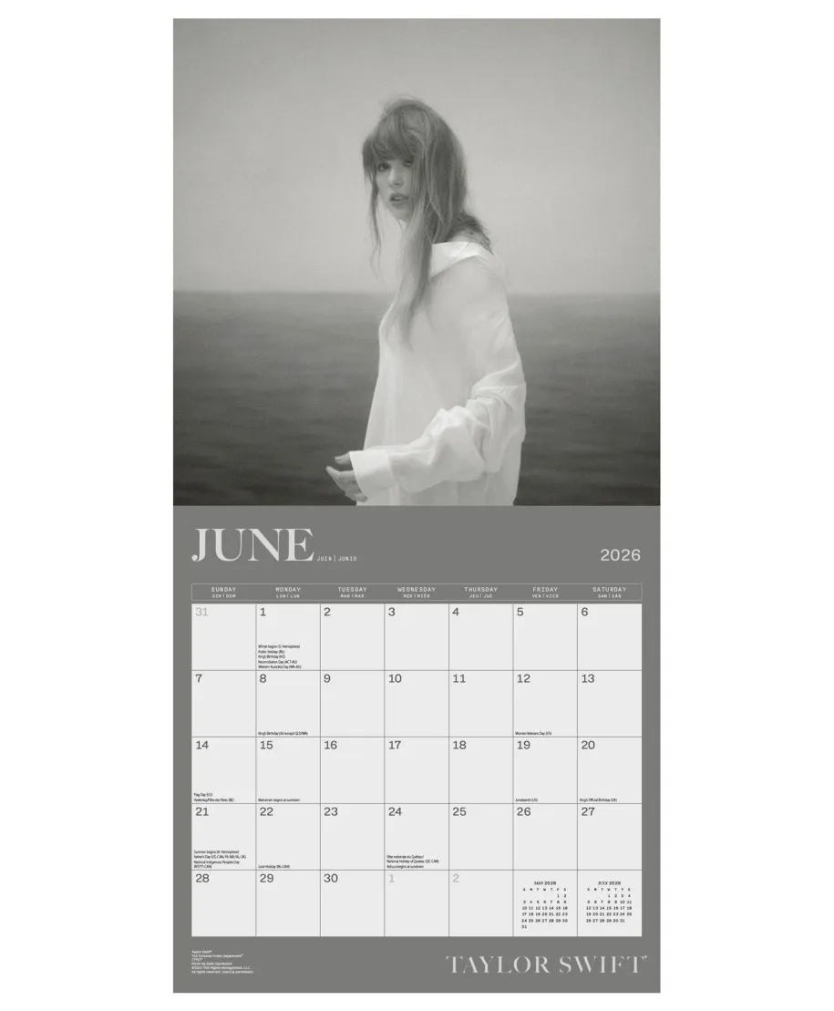 Taylor Swift oficjalny kalendarz na ścianę na 2026rok Oryginalny i licencjonowany kalendarz, posiada 12 rozkładanych stron o wymiarach 30x60 cm. Na każdej z kart znajduje się duża fotografiaoraz czytelne kalendarium z miejscem na notatki. W kalendarzu znajduje się 12 unikalnych zdjęć dla każdego miesiąca. Okładki wykonane są z papieru powlekanego matowego i laminowanego o gramaturze 250 g/m?, wnętrze z papieru powlekanego matowego o gramaturze 150 g/m?. Nagłówki są w językach angielskim, francuskim, hiszpański. Oprawa zszywkowa. Złożony kalendarz 30x30 cm. Rozłożony kalendarz 30x60 cm. Zawiera otwór 5 mm do zawieszenia na ścianie.