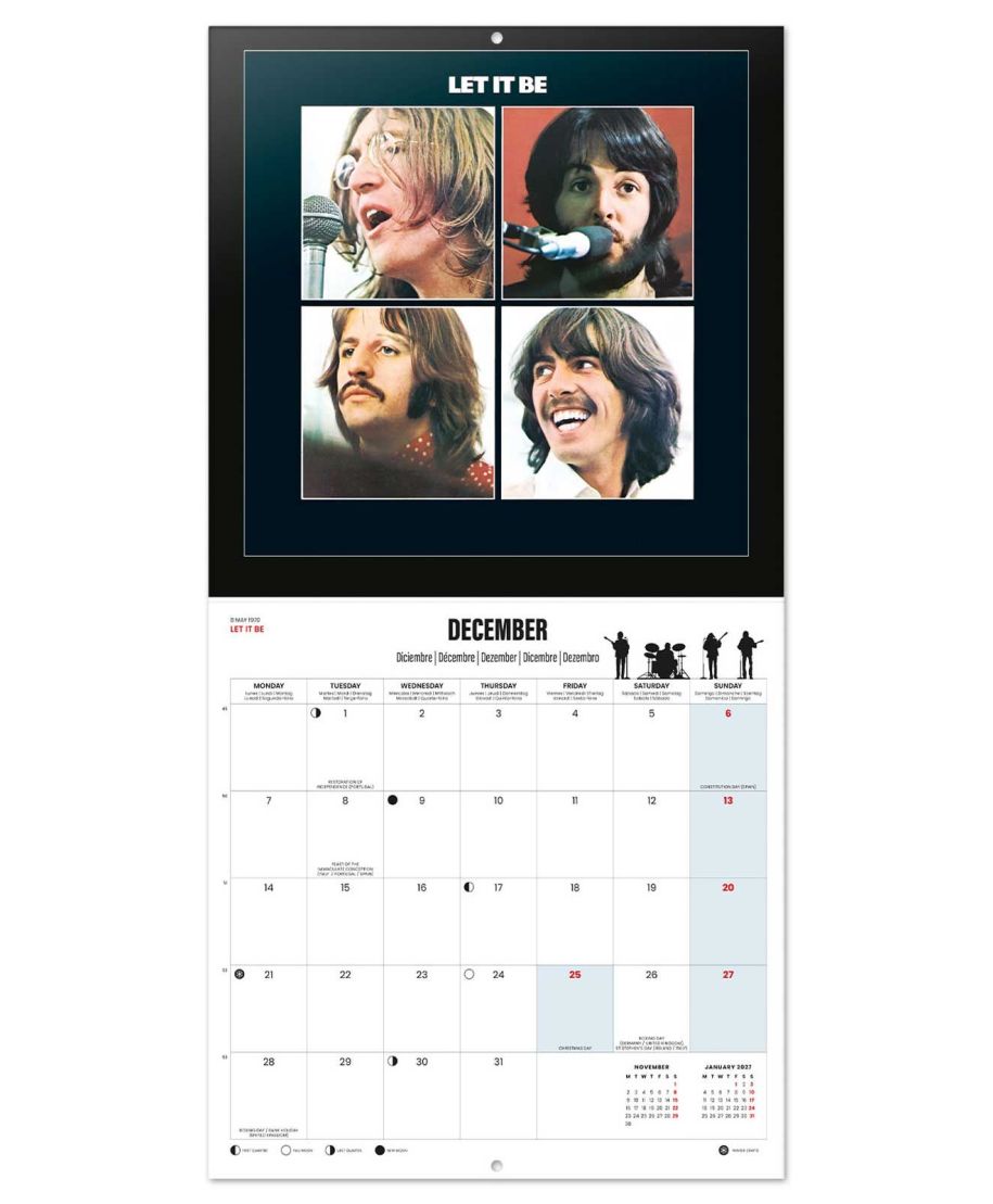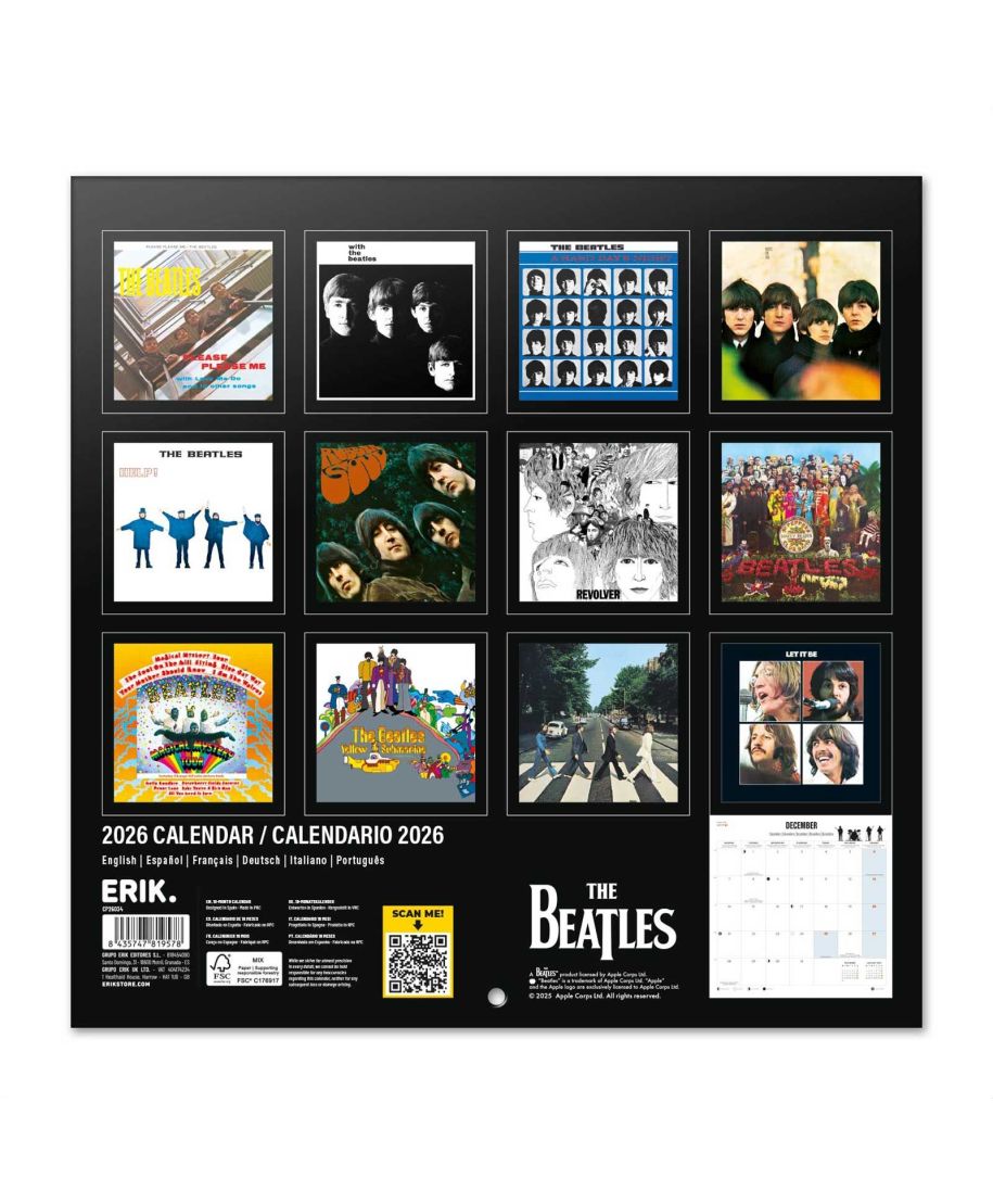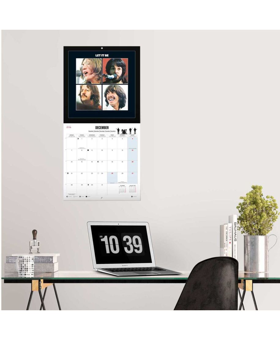The Beatles oficjalny kalendarz na ścianę na 2026rok Oryginalny i licencjonowany kalendarz, posiada 12 rozkładanych stron o wymiarach 30x60 cm. Na każdej z kart znajduje się duża fotografiaoraz czytelne kalendarium z miejscem na notatki. W kalendarzu znajduje się 12 unikalnych zdjęć dla każdego miesiąca + plakat. Okładki wykonane są z papieru powlekanego matowego i laminowanego o gramaturze 250 g/m2, wnętrze z papieru powlekanego matowego o gramaturze 150 g/m2. Nagłówki są w 6 językach:angielski, hiszpański, francuski, włoski, niemiecki i portugalski. Oprawa zszywkowa. Złożony kalendarz 30x30 cm. Rozłożony kalendarz 30x60 cm. Zawiera otwór 5 mm do zawieszenia na ścianie.