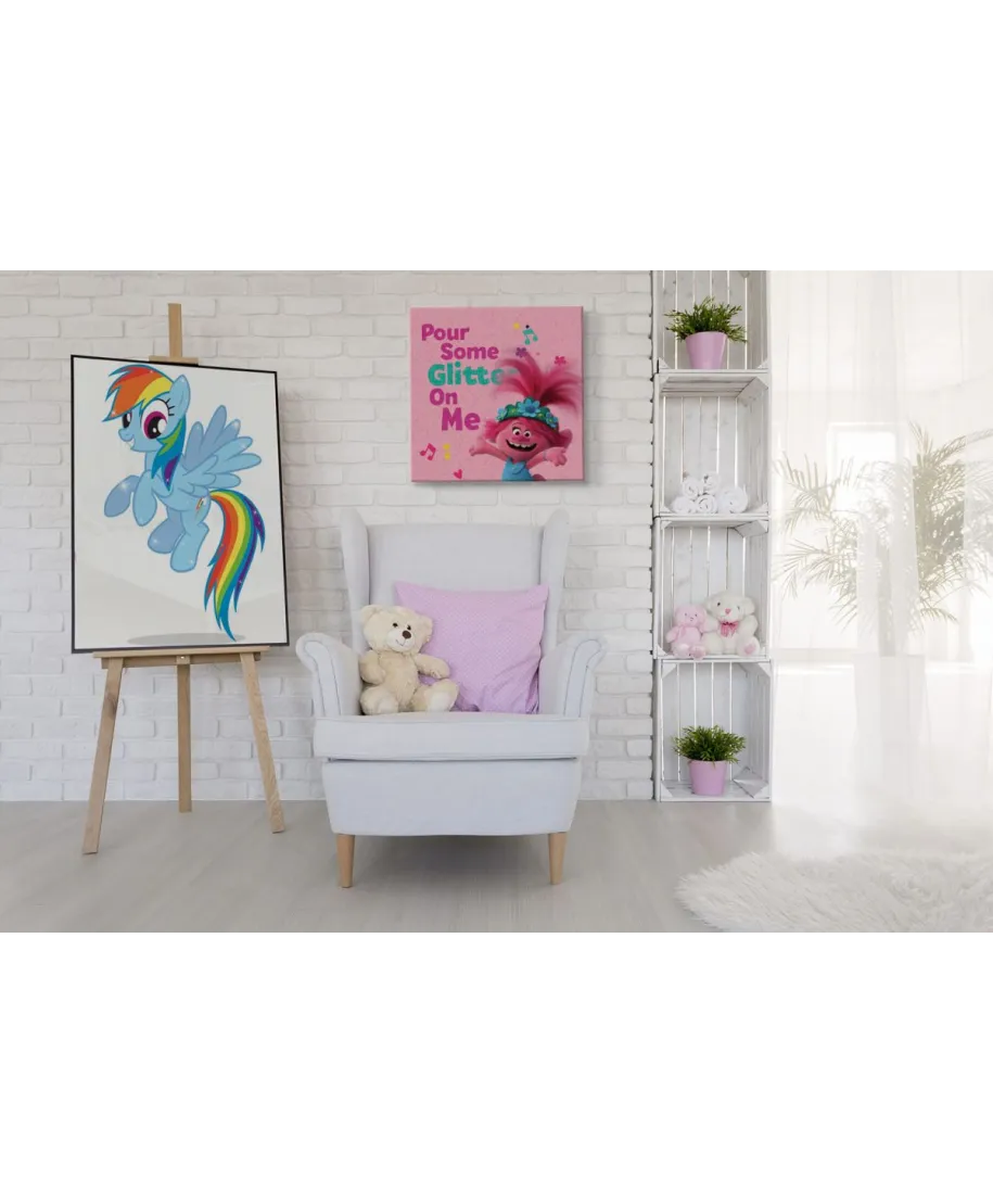 Trolls World Tour Pour Some Glitter On Me - obraz na płótnie Oryginalny i licencjonowany obraz na płótnie idealny na każdą ścianę. Nasze obrazy wyróżniają: Fantastyczne barwy Wysokie nasycenie barw i ostrość, kolory utrzymują się przez długie lata. Płótno wysokiej jakości Płótno bawełniane 300g/m2 jest trwałe i mocne, jego struktura jest naturalna. Trwałe kolory, Dodatkowo lakierowana powierzchnia sprawia, że kolory są żywe przez dziesięciolecia. Solidna rama, Wykonana jest z naturalnego, sosnowego drewna, jest mocna i gruba a obraz solidny i wytrzymały. Zadrukowane boki, obrazy posiadają zadrukowane boki, nie potrzebują żadnej dodatkowej oprawy. Szczegóły techniczne: wydruk na płótnie bawełnianym 300g/m2 sosnowe krosna o grubości 2 cm i szerokości 3,5 cm druk cyfrowy