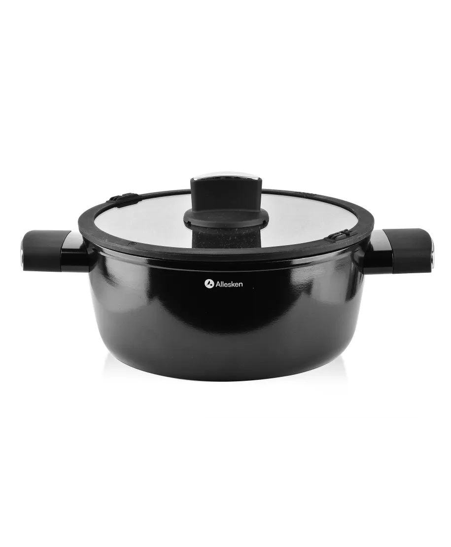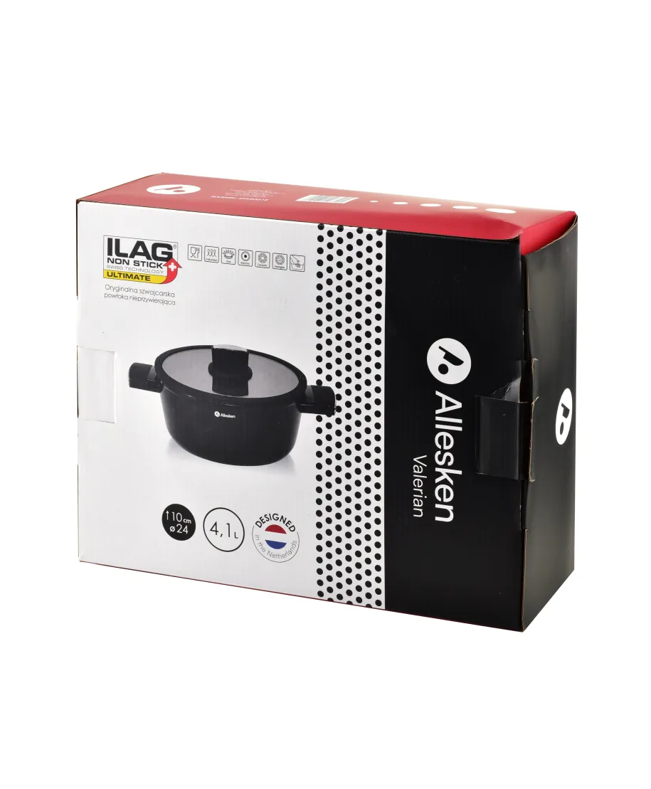 Garnek VALERIAN z marki ALLESKEN.\. żaroodporne aluminium do 160C\. powłoka ILAG Ultimate NON STICK (3 warstwowa innowacyjna\powłoka) która zapewnia nieprzywieranie potraw (właściwości\antyadhezyjne)\. szklana pokrywa z uchwytem i silikonowym rantem ułatwiającym odcedzanie . do wszystkich rodzajów kuchenek, FULL INDUCTION\. produkt przystosowany do mycia w zmywarce\. wytrzymały i trwały materiał, dno o grubości ok. 4mm\. odporny na zarysowania i ścieranie\. krawędź dostosowana do różnych sposób odcedzania\\wymiary: 24x25xh10,5cm\waga:1,624kg/1,824kg z opakowaniem poj. 4,1L\zapakowany jednostkowo w color box 33x16xh12cm\