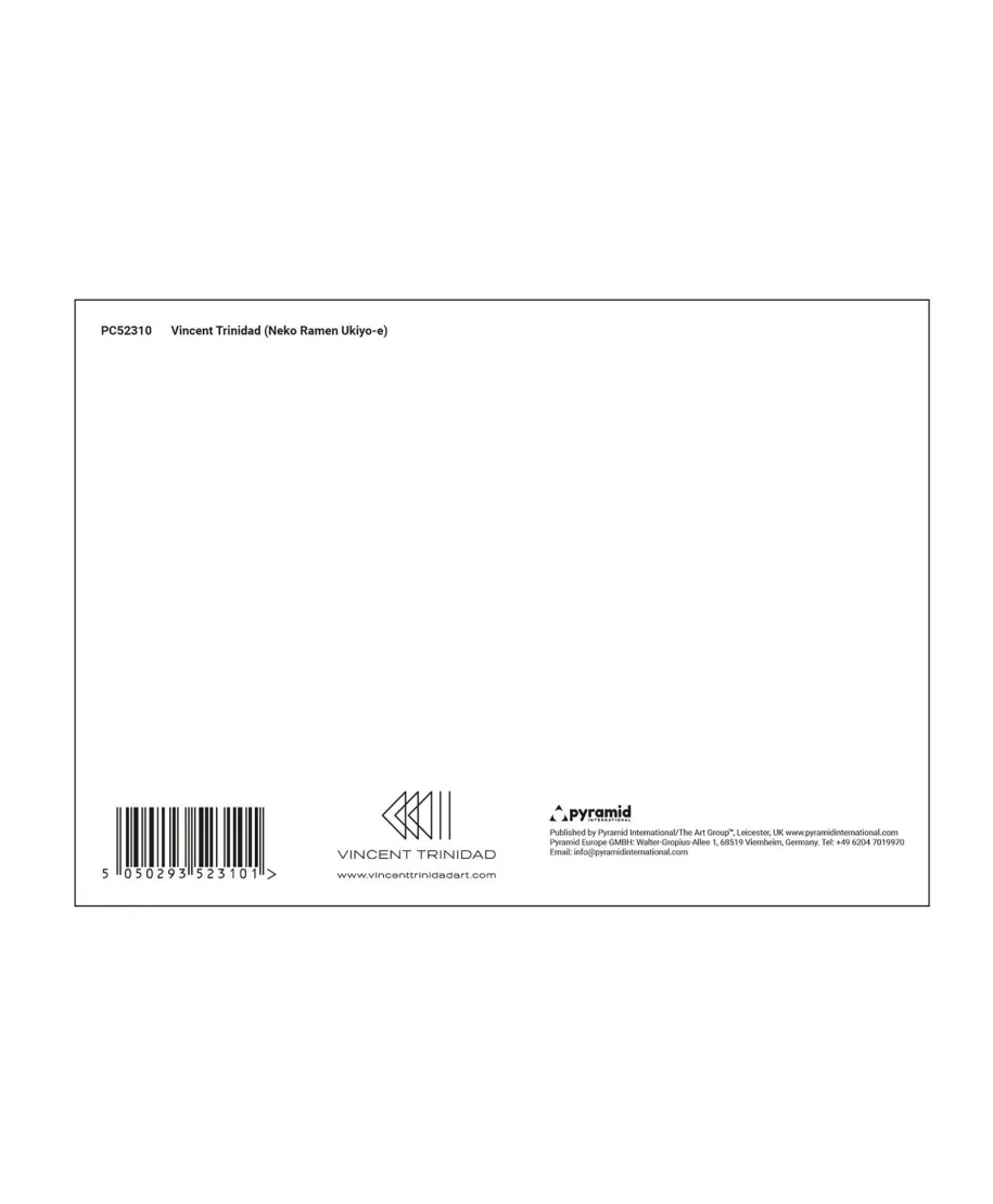 Pocztówka Vincent Trinidad Neko Ramen Ukiyo Urocza pocztówka z grafiką autorstwa Vincenta Trinidada przedstawiającą kota jedzącego ramen w stylu ukiyo-e. Idealny prezent dla miłośników japońskiej kultury, sztuki i kuchni. Może być wysłana jako serdeczne pozdrowienie lub ozdoba do kolekcji. Ta wyjątkowa ilustracja sprawia, że każda wiadomość nabiera wyjątkowego charakteru. Szczegóły techniczne: Wymiary: 14,8 x 10,5 cm Materiał: wysokiej jakości papier Druk w pełnym kolorze Oficjalnie licencjonowany produkt.
