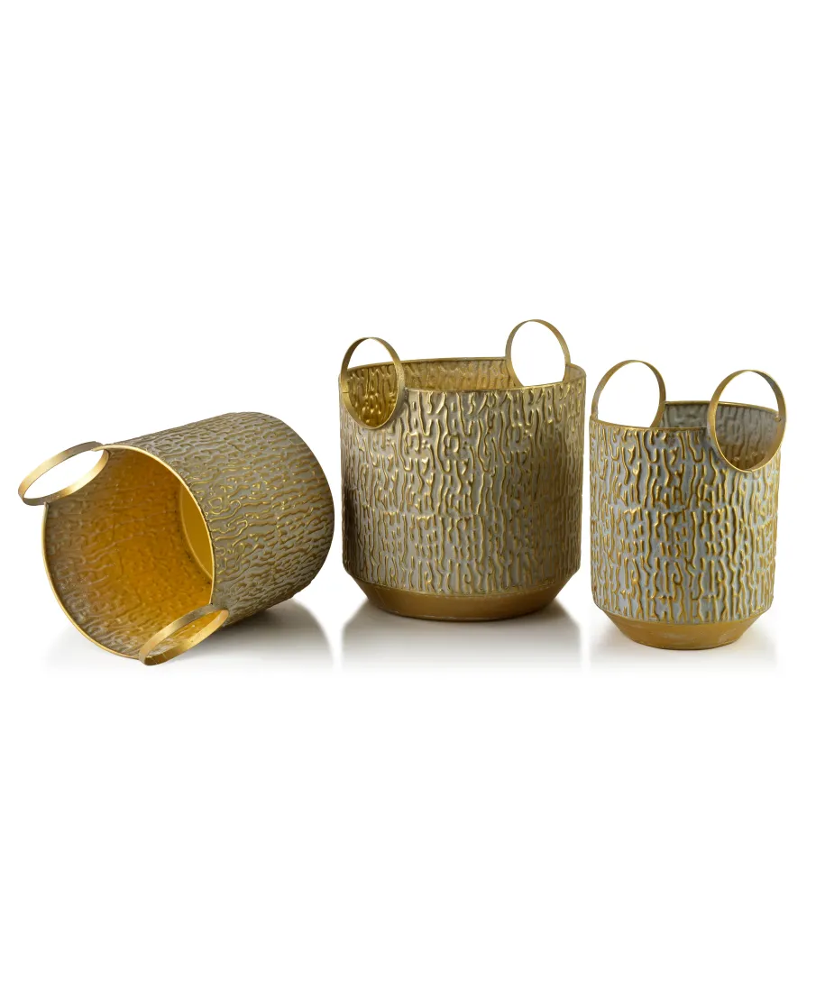Komplet 3 osłonek VINTAGE GLOWMateriał: metalWykończenie: złote, matoweStyl: elegancki, ponadczasowy, pasujący do wnętrz glamour, klasycznych i nowoczesnychZastosowanie: osłonki na doniczki, element dekoracyjny na półkę, stolik czy komodę.Tego typu zestaw sprawdzi się zarówno do eksponowania roślin, jak i jako ozdoba sama w sobie. Złote, matowe wykończenie dodaje wnętrzu ciepła i elegancji, a metalowa konstrukcja zapewnia trwałość.XL 33X32X30/36CM z uchwytamiL 27x27x29/35cmM 22x22x27/33cm
