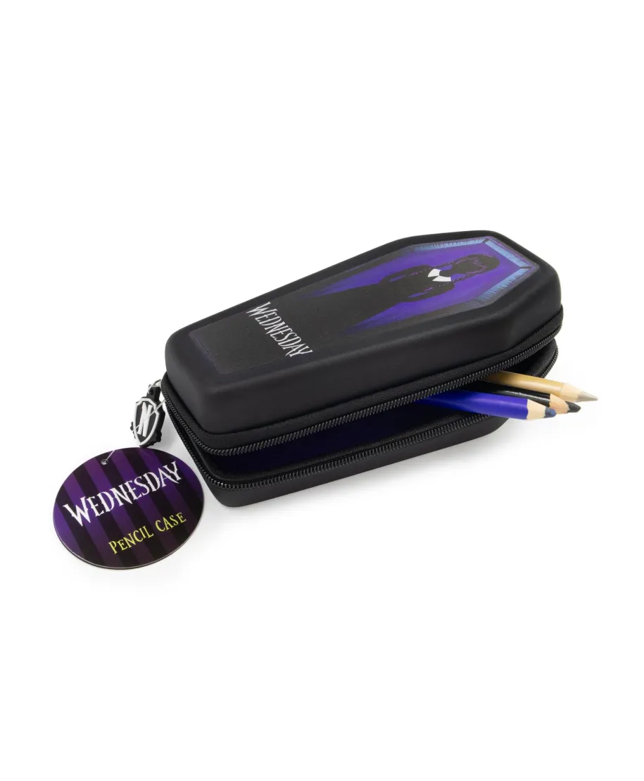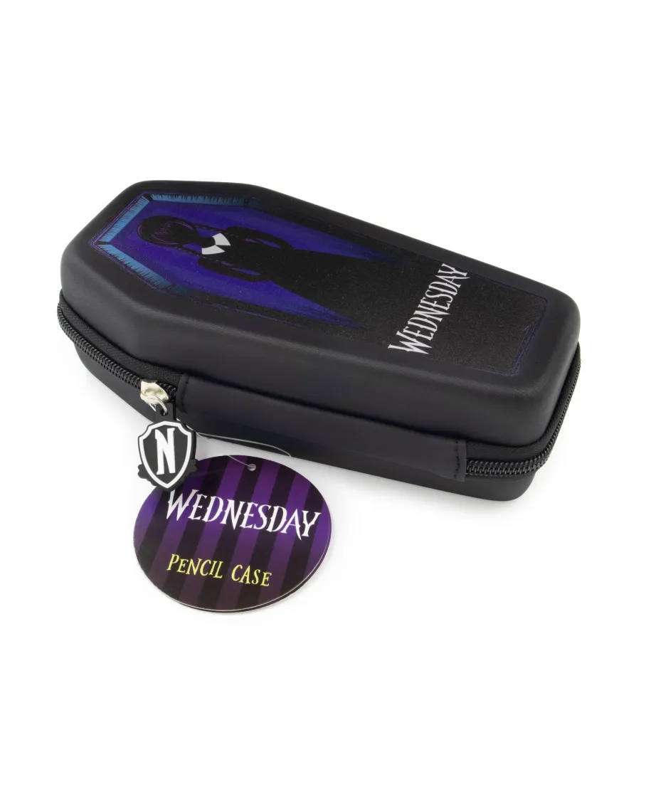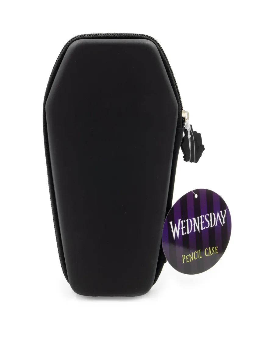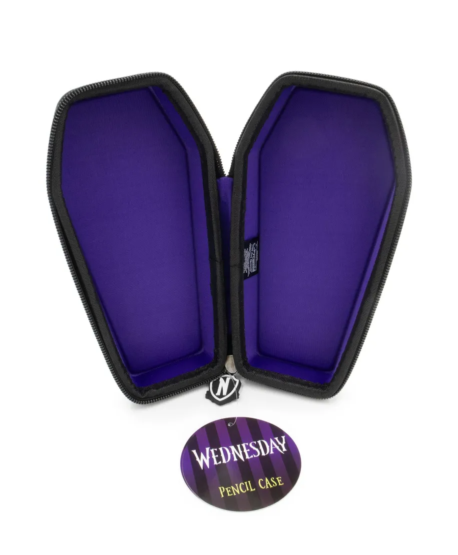 Wednesday Coffin - piórnik w kształcie trumny Odkryj wyjątkowy piórnik inspirowany gotyckim klimatem serialu "Wednesday". Piórnik w kształcie trumny z minimalistycznym wizerunkiem Wednesday Addams to doskonały wybór dla fanów mrocznych motywów. Kompaktowy i funkcjonalny, idealnie sprawdzi się do przechowywania przyborów szkolnych lub biurowych. Wykonany z wytrzymałego materiału i wyposażony w solidny zamek, zapewnia trwałość oraz wygodę użytkowania, a jego unikalny design sprawia, że wyróżnia się na tle standardowych akcesoriów. Szczegóły techniczne: Wymiary: 11 x 20 cm Materiał: Wytrzymały materiał syntetyczny Zamknięcie: Zamek błyskawiczny Oryginalny, licencjonowany produkt idealny wybór dla fanów serialu "Wednesday".