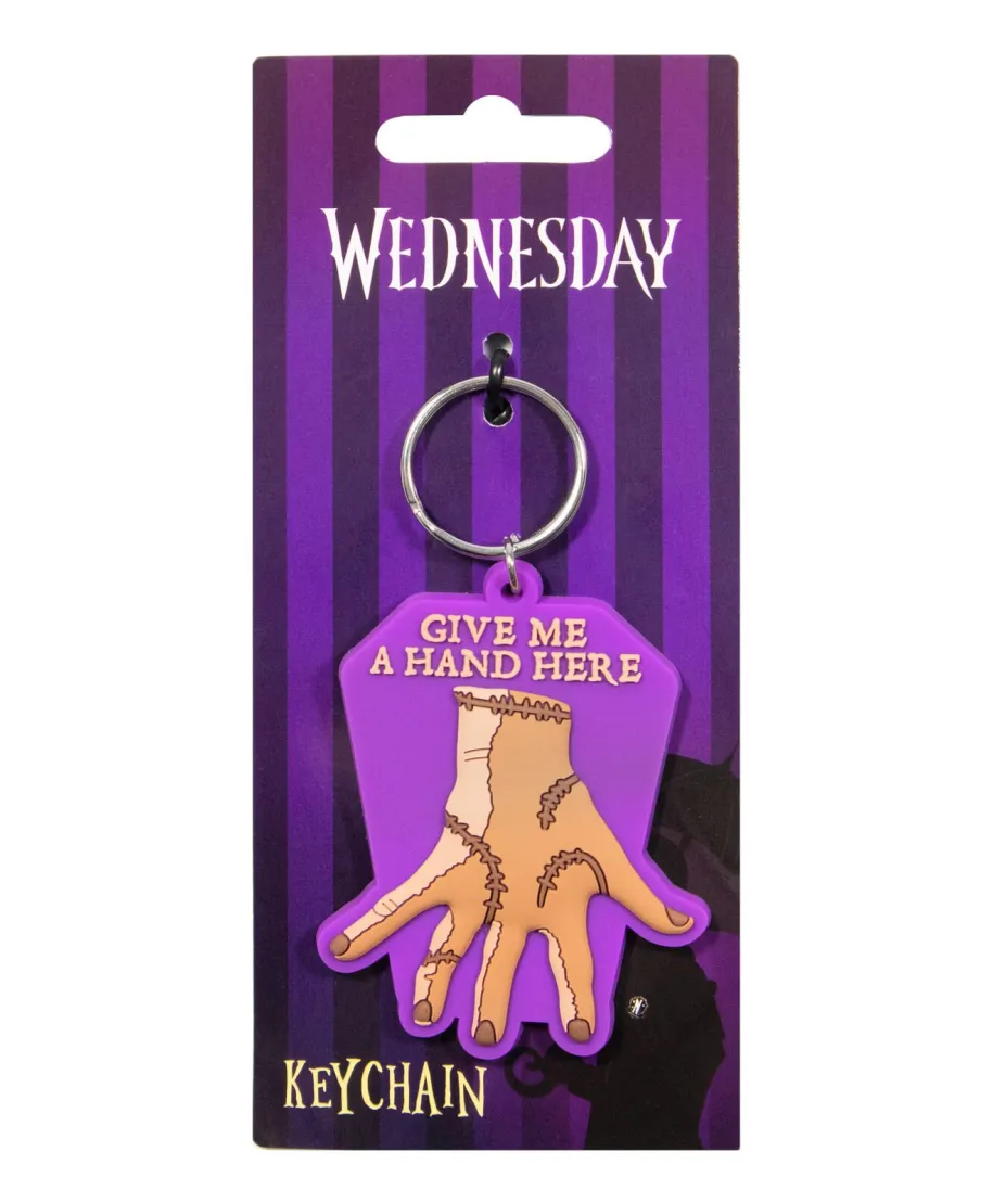 Wednesday Give Me A Hand - brelok Brelok składa się z gumowej zawieszki oraz metalowego oczka. Będzie kapitalnie prezentował się przy Twoich kluczach. Breloki to świetny pomysł na nagrodę w konkursie szkolnym czy zabawach. Gadżet posiada oficjalną licencję producenta. Przedstawiony brelok ma rozmiar ok. 4,5x6cm. Marka: Pyramid Posters