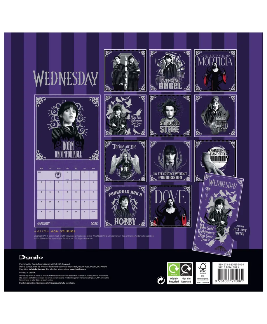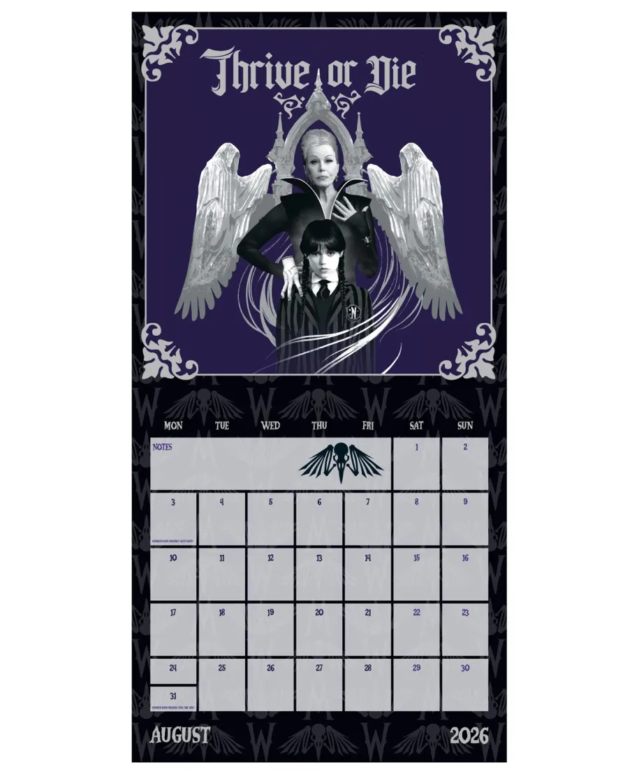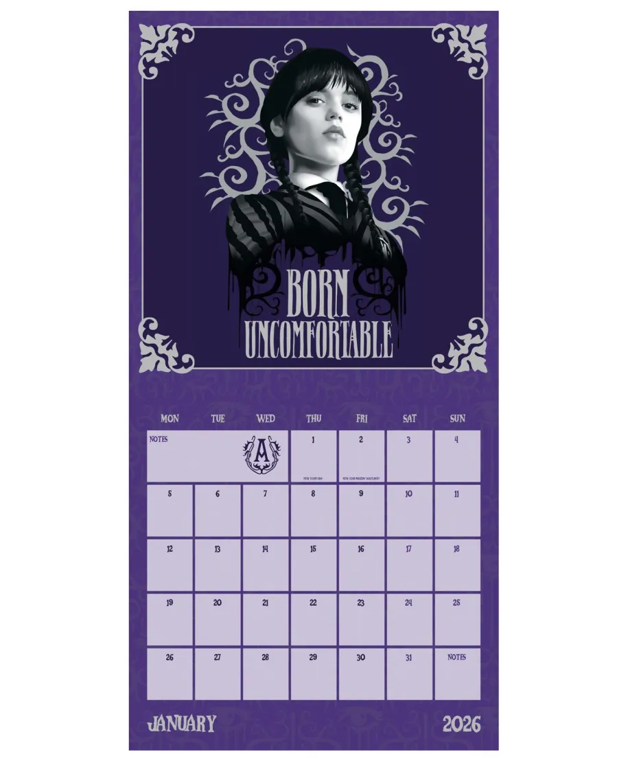 Wednesday oficjalny kalendarz na ścianę na 2026rok Oryginalny i licencjonowany kalendarz, posiada 12 rozkładanych stron o wymiarach 30x60 cm. Na każdej z kart znajduje się duża fotografiaoraz czytelne kalendarium z miejscem na notatki. W kalendarzu znajduje się 12 unikalnych zdjęć dla każdego miesiąca + plakat. Okładki wykonane są z papieru powlekanego matowego i laminowanego o gramaturze 250 g/m?, wnętrze z papieru powlekanego matowego o gramaturze 150 g/m?. Nagłówki są w języku angielskim. Oprawa zszywkowa. Złożony kalendarz 30x30 cm. Rozłożony kalendarz 30x60 cm. Zawiera otwór 5 mm do zawieszenia na ścianie.