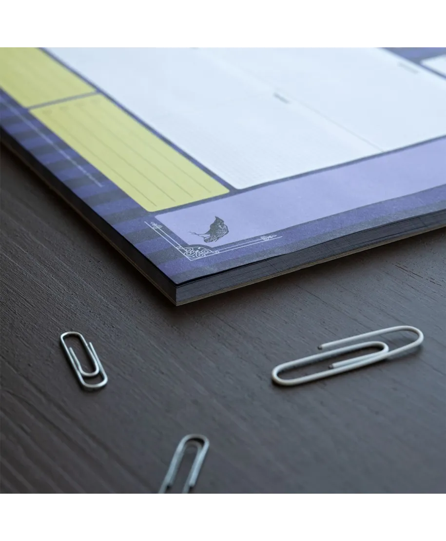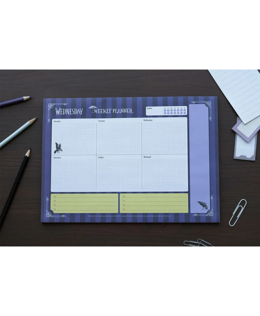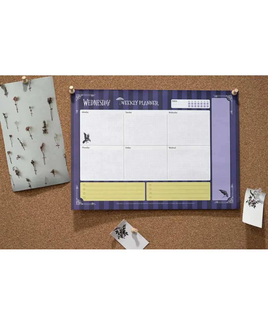 Tygodniowy planer A4 Wednesday Raven Elegancki tygodniowy planer A4 z motywem Wednesday Addams to idealne narzędzie do organizacji zadań. Dzięki wyrazistemu nadrukowi z grafiką kruka, produkt wyróżnia się na tle innych planerów. Wykonany z wysokiej jakości materiałów, w orientacji poziomej, oferuje dużą przestrzeń na codzienne notatki. Idealny dla uczniów, studentów i pracujących, którzy cenią sobie funkcjonalność i oryginalny styl. Szczegóły techniczne: Format: A4 (29,7 x 21 cm) Układ: Tygodniowy Okładka: Brak Orientacja: Pozioma Produkt w pełni licencjonowany, doskonały do sprzedaży detalicznej oraz jako prezent dla fanów serialu "Wednesday".