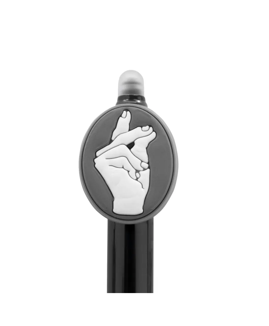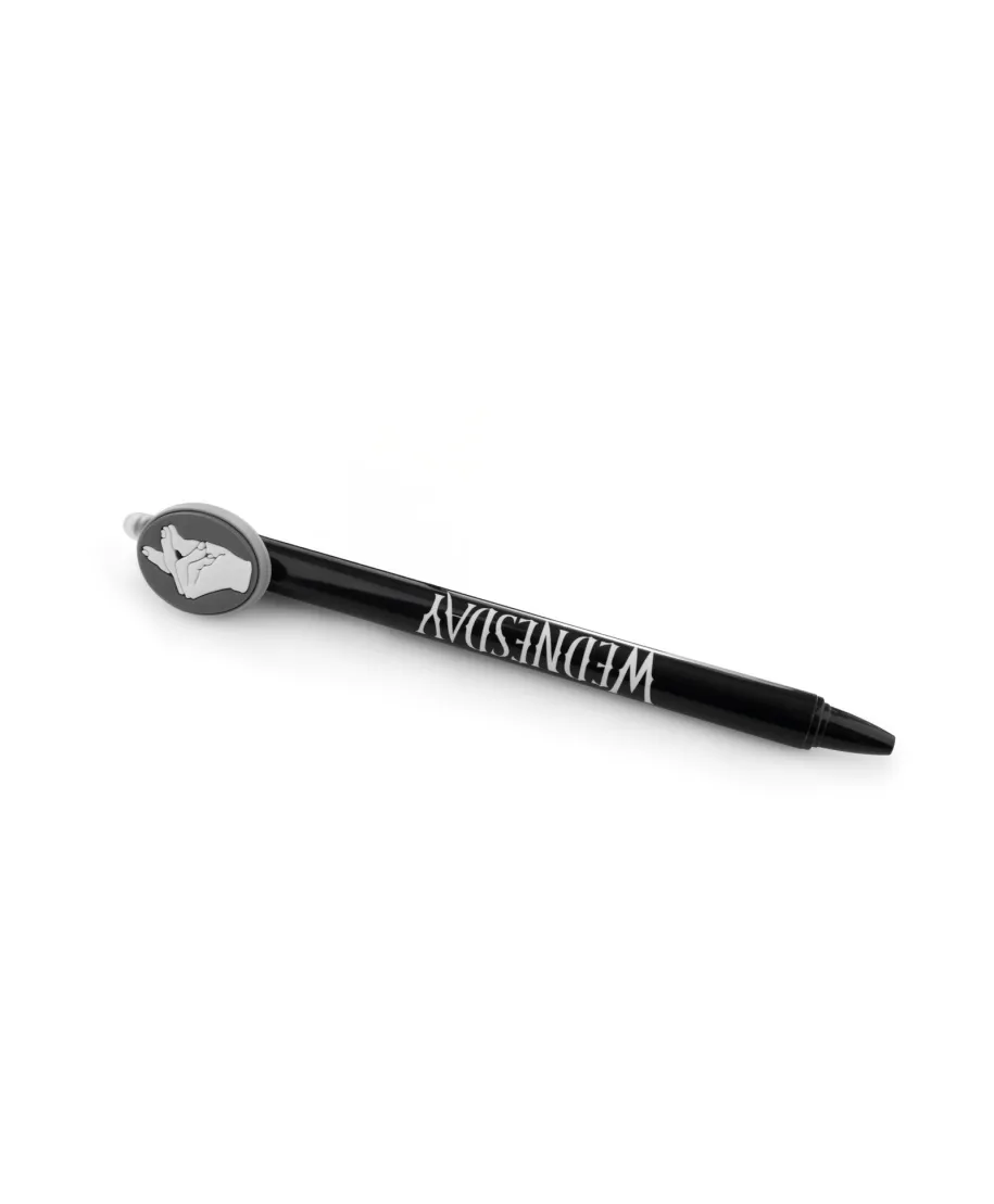 Długopis zmywalny Wednesday Snap Długopis z motywem gestu snap z serialu Wednesday. Klikany, z niebieskim wkładem i gumką do ścierania idealny dla fanów Nevermore. Szczegóły techniczne Wkład: niebieski Mechanizm: klik Końcówka: gumka Motyw: Snap Oficjalny, licencjonowany produkt Wednesday.