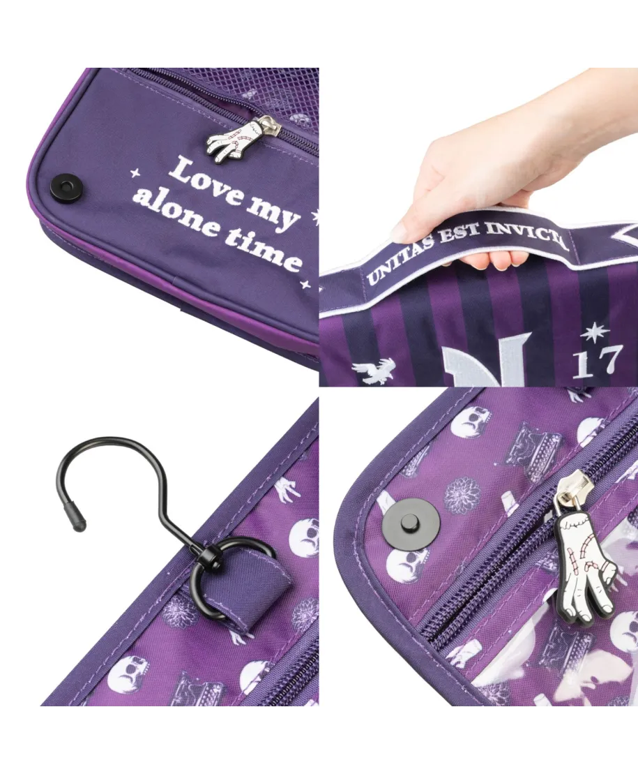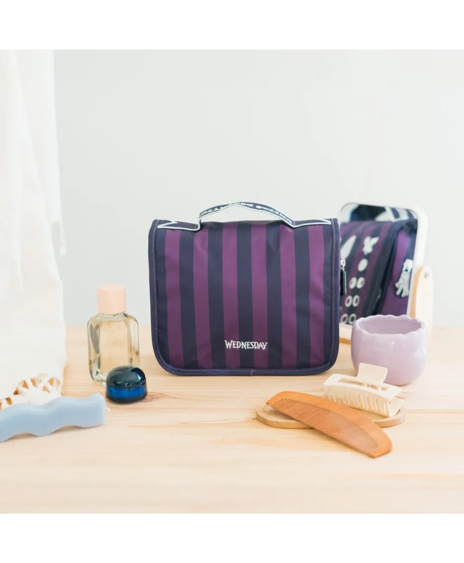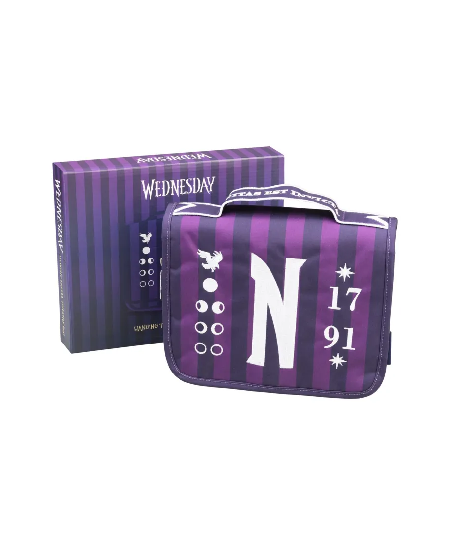 Wisząca kosmetyczka Wednesday stylowa i praktyczna Kosmetyczka podróżna inspirowana serialem "Wednesday" to funkcjonalne akcesorium z charakterem. Rozwijana konstrukcja z haczykiem, wewnętrzne kieszonki i wyjątkowy design czynią ją idealną na każdą podróż. Niewielki rozmiar po złożeniu sprawia, że zmieści się w każdej torbie. Szczegóły techniczne Rozwijana forma z haczykiem do zawieszenia Wiele przegródek i kieszeni Design z motywem Nevermore Academy Wymiary po złożeniu: ok. 20x25x9,5 cm Licencjonowany produkt Produkt oficjalnie licencjonowany idealny dla fanek estetyki "Wednesday".