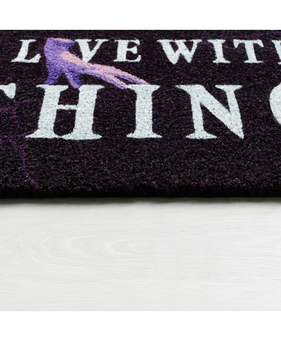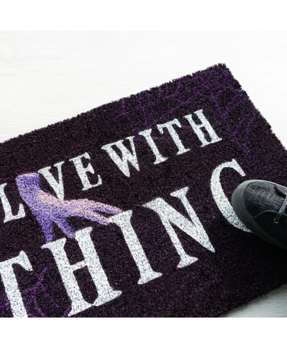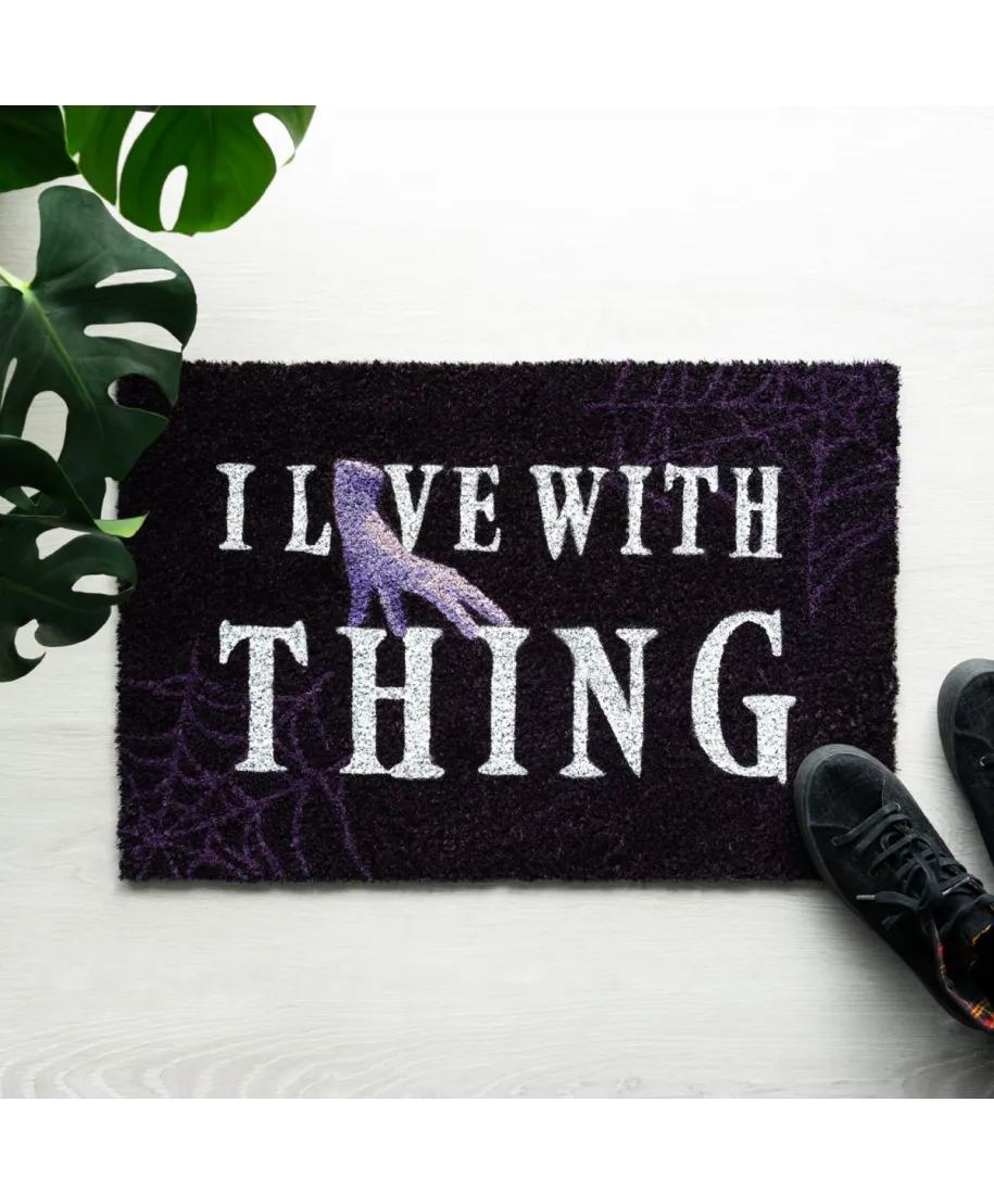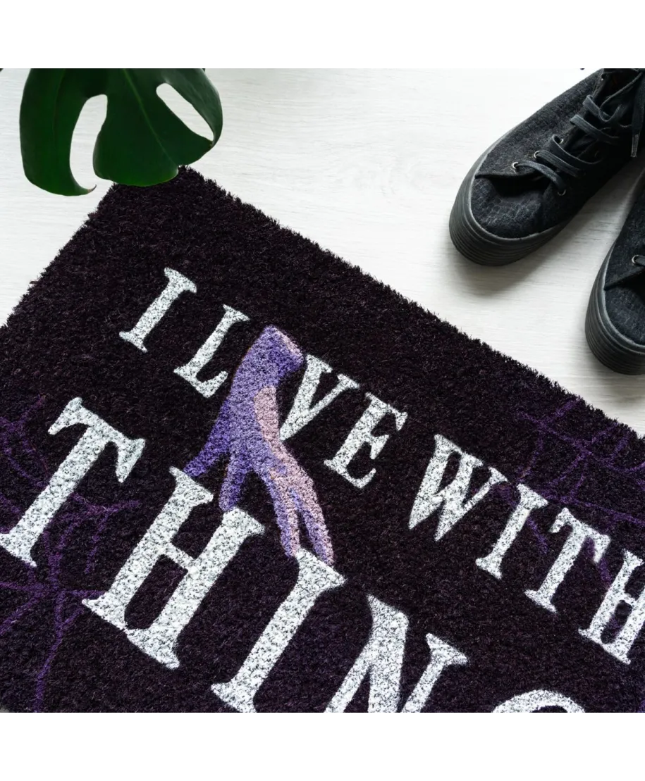 Wednesday wycieraczka I Live with Thing Wycieraczka inspirowana serialem Wednesday z kultowym napisem I Live with Thing i grafiką Rączki. Idealna dla fanów gotyckiego stylu i czarnego humoru. Szczegóły techniczne: Motyw: serial Wednesday Kolorystyka: czarno-fioletowa Zastosowanie: uniwersalne Oficjalna licencja Praktyczny i zabawny dodatek do domu fana Wednesday.